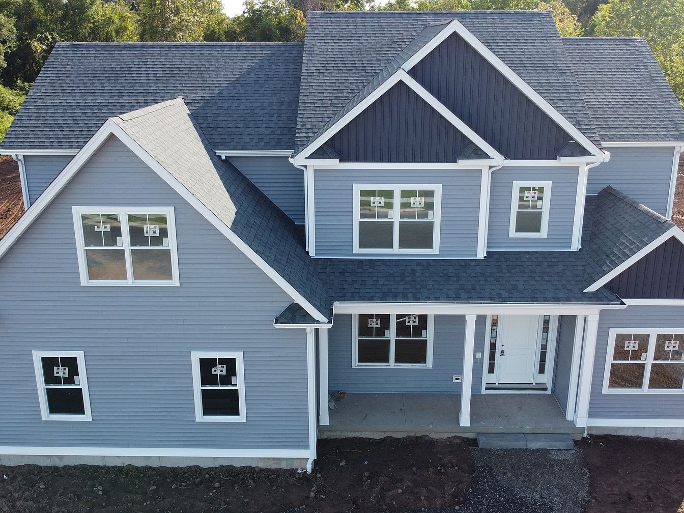 A modern, two-story home with a striking combination of blue siding and stone accents stands proudly under a clear blue sky. The prominent gable roof, featuring dark shingles, adds an elegant touch. Windows arranged symmetrically provide ample natural light, with white trim highlighting the architectural details. The left side showcases natural stone, contrasting beautifully with the navy blue panels. A welcoming front porch, supported by sturdy columns, invites visitors, leading to a solid wooden door. Surrounding the house, a dirt lot hints at landscaping potential, while the expansive front yard suggests space for outdoor activities.