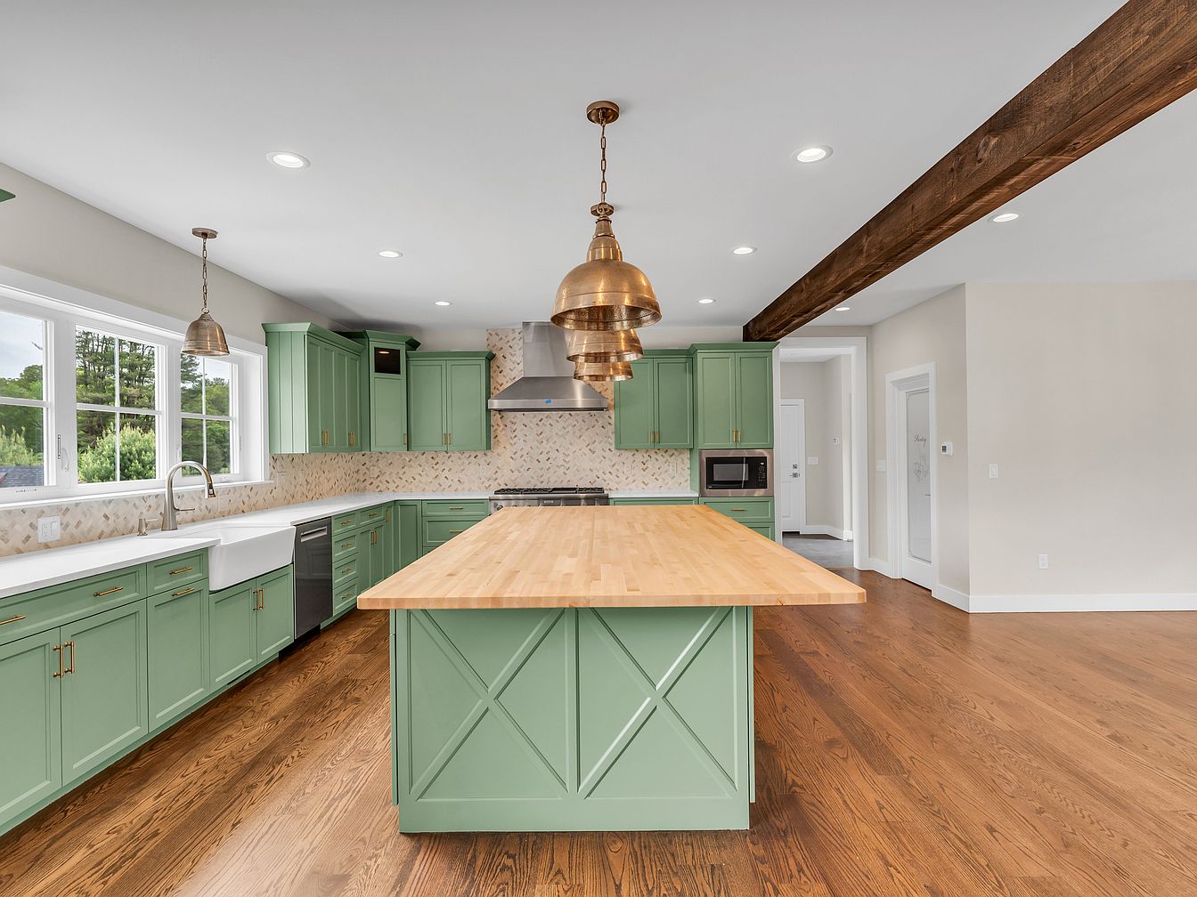 This expansive kitchen features a mix of modern and traditional elements. The cabinetry is a soft green, complemented by sleek gold hardware, creating a fresh and inviting atmosphere. A large island with a natural wood countertop serves as a focal point, offering ample space for meal preparation. The back wall showcases a stylish backsplash in muted tones, providing visual interest under the stainless steel appliances. Natural light floods the room through large windows, enhancing the warm hues of the hardwood flooring. Unique pendant lights add elegance, accentuating the rustic wooden beam overhead and enriching the overall aesthetic.
