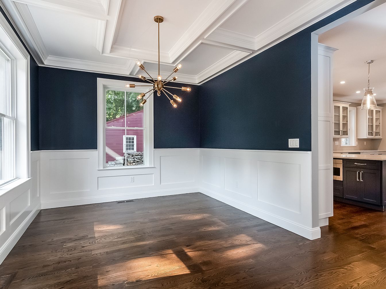 A modern dining room incorporating a striking contrast of dark navy walls against crisp white wainscoting. The room features tall windows that flood the space with natural light, highlighting the rich, dark hardwood floors. An elegant, contemporary chandelier with multiple light sources hangs from the ceiling, accentuating the room’s sophistication. Architectural details include a coffered ceiling, adding depth and character. The corner shows a glimpse of an open kitchen with dark cabinetry and glass doors, creating a seamless flow between spaces. Overall, the design balances traditional elements with modern aesthetics for a welcoming atmosphere.