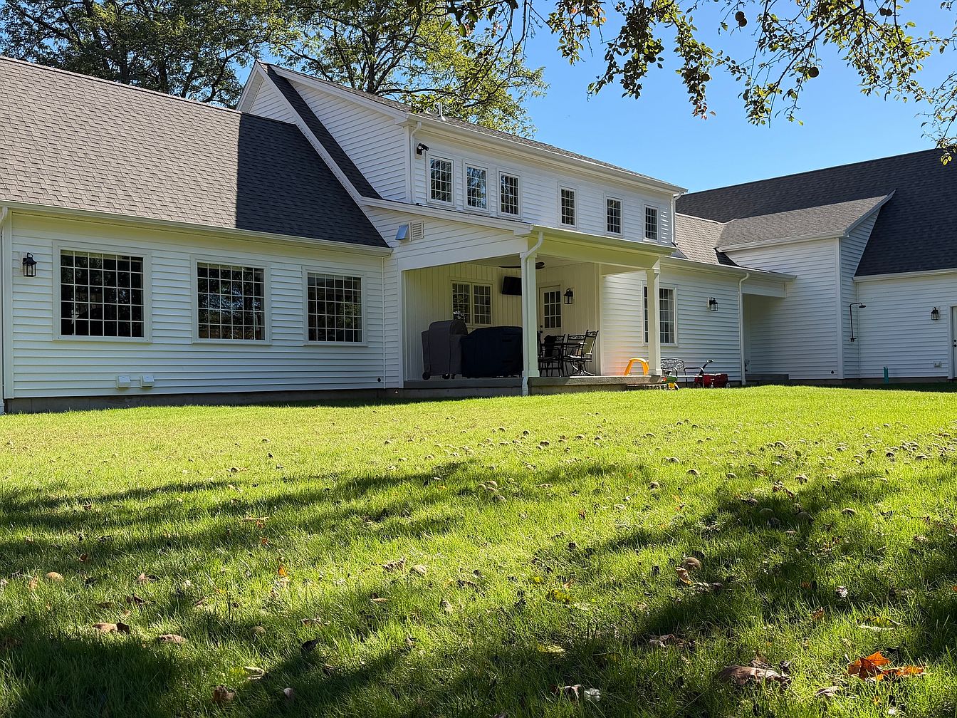 This image showcases the rear exterior of a charming two-story American home. The house features classic white horizontal siding, accentuated by numerous large, multi-paned windows, providing ample natural light. A sturdy gray roof with steep angles adds character. Below a covered porch, dark wicker furniture invites relaxation. The expansive green lawn, dotted with scattered leaves, enhances the inviting atmosphere. The porch is framed by elegant white columns, with soft sunlight creating a warm ambiance. Surrounding trees cast playful shadows, while the overall design reflects a modern yet timeless appeal, perfect for outdoor gatherings.