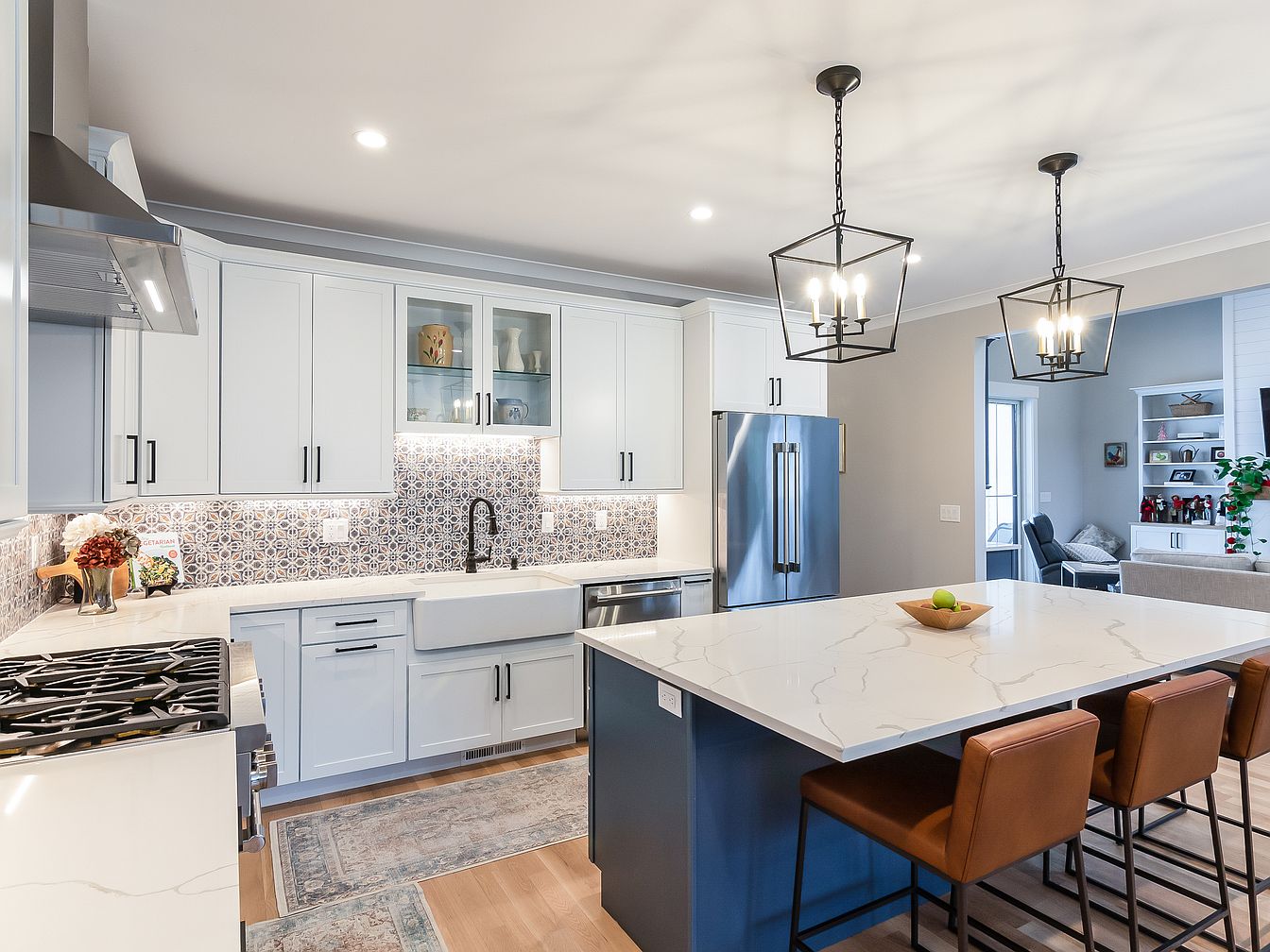 This modern kitchen features a spacious layout centered around a large island with a striking white marble countertop, accented by delicate grey veining. The cabinetry boasts a soft blue finish, complemented by sleek black hardware, contributing to a clean aesthetic. Geometric tile backsplash adds visual interest, while under-cabinet lighting enhances the space’s warmth. To the side, a stainless-steel refrigerator contrasts elegantly with the cabinetry. Pendant lights in a black frame hang above the island, casting artistic shadows. A plush area rug in muted tones ties the design together, creating a harmonious space that is both functional and inviting.