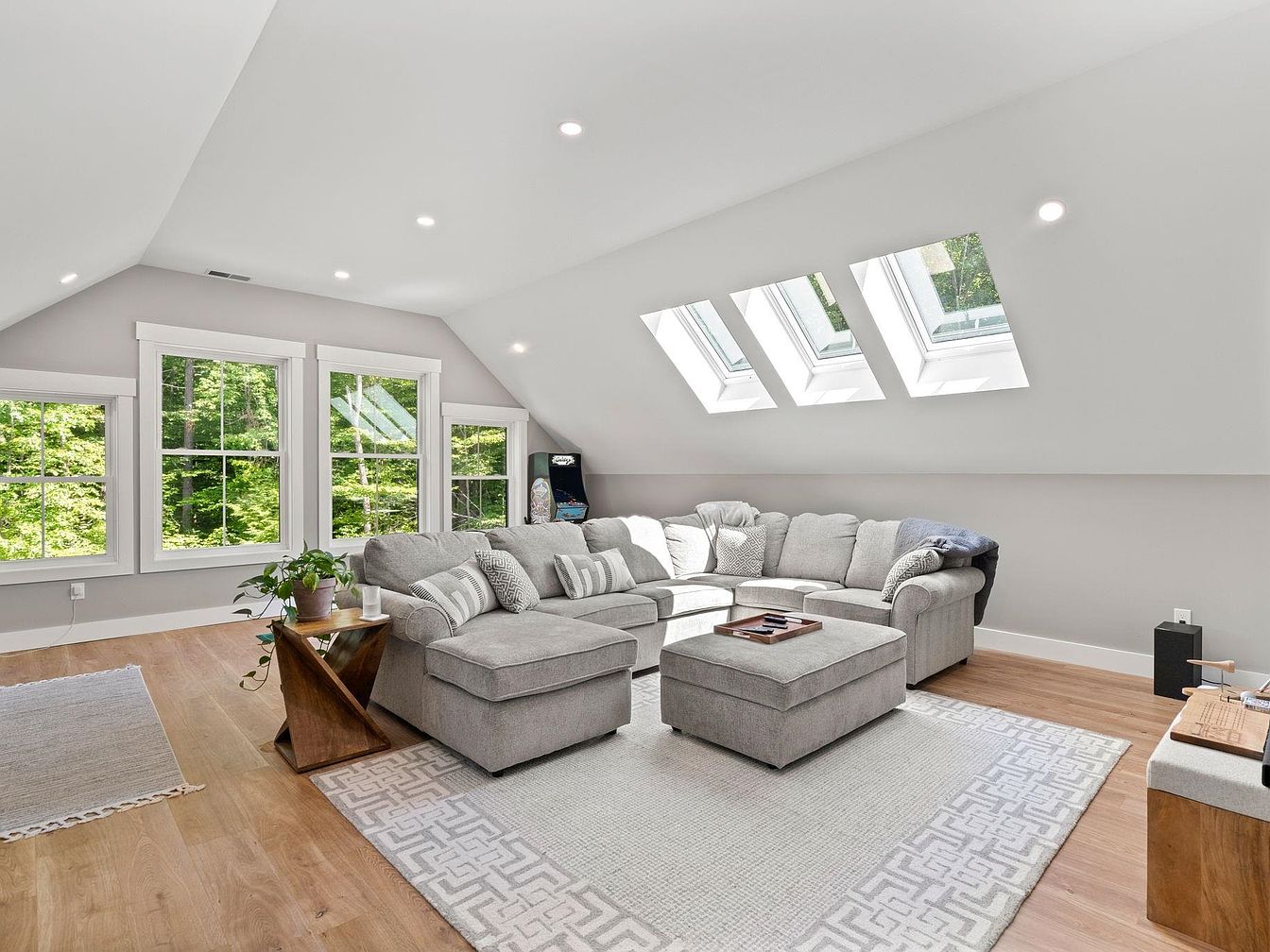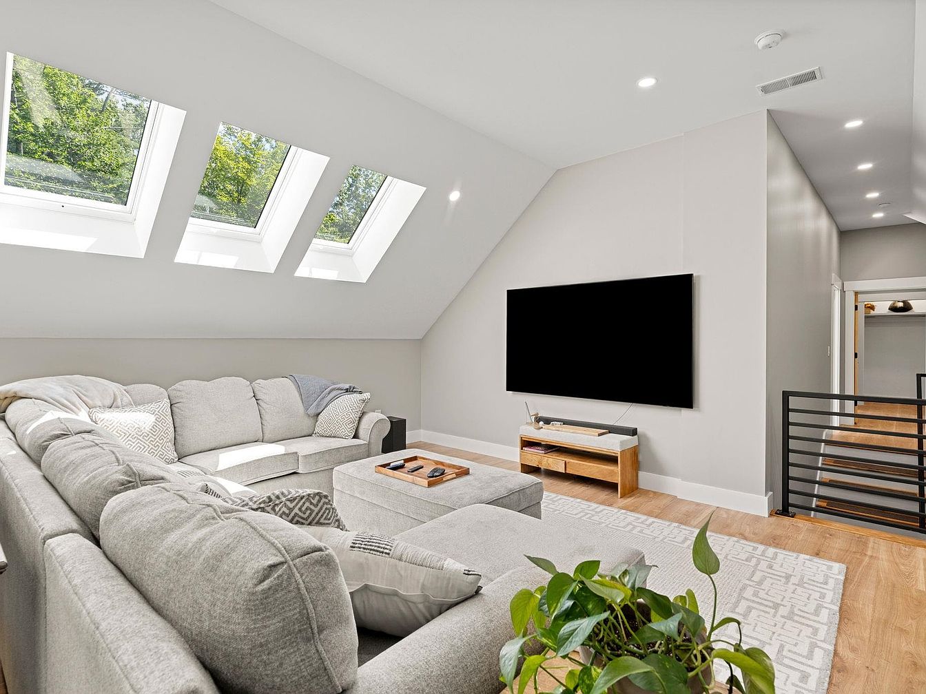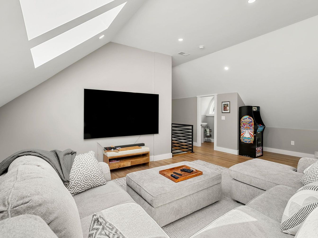 An airy, modern loft space featuring light-gray walls and angled ceilings with two large skylights allowing abundant natural light. A large flat-screen TV is mounted on one wall above a sleek, wooden stand, with remotes neatly arranged on a tray atop the plush, corner sectional sofa upholstered in soft gray fabric. Patterned throw pillows and a subtle area rug add texture and comfort. Warm wood flooring contrasts with the cool palette, while a classic arcade game stands in the corner, hinting at a fun, relaxed atmosphere. Clean lines, open layout, and minimal decor create a welcoming yet contemporary retreat.