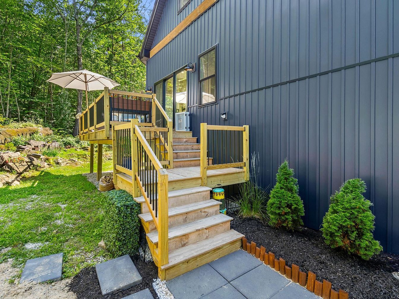 A natural wood stairway leads up to a raised deck attached to the side of a house with modern charcoal metal siding. The deck is bordered by a wooden railing with black balusters and features an outdoor dining area shaded by a large white patio umbrella. The steps are wide and surrounded by neat landscaping, including small evergreen shrubs, mulch beds with a wooden border, and pavers set into the green lawn. The scene feels bright and welcoming, with the deck and house set against a forested backdrop that provides both privacy and a sense of tranquility.