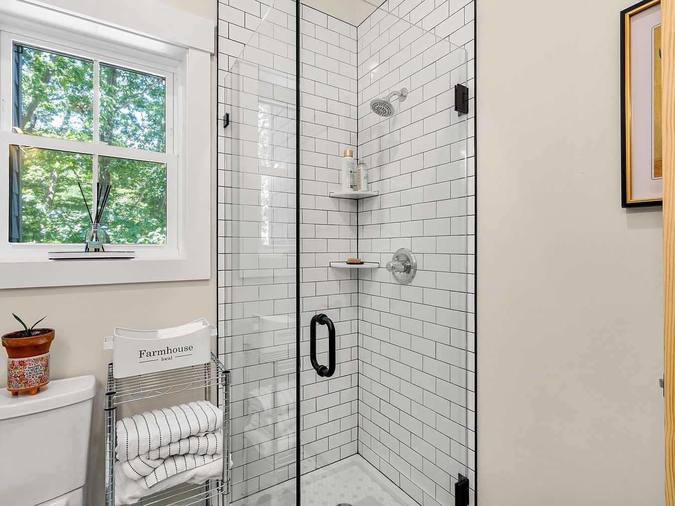A small, bright bathroom featuring a glass-enclosed shower with white subway tile walls in a grid pattern accented by dark grout. The clean, modern design is complemented by a chrome showerhead and fixtures as well as built-in corner shelves holding neatly arranged shower products. A double-hung window with white trim allows natural light to fill the space and offers a view of leafy green trees outside. Nearby, a wire towel rack with folded striped towels adds practicality, while a small potted plant on the white toilet brings a touch of color and life to the serene, neutral-toned room.