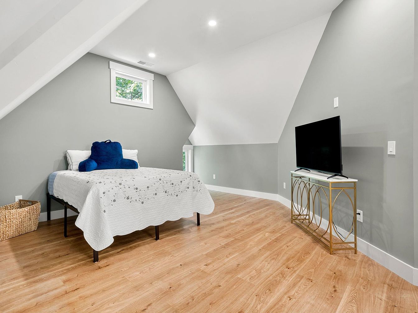 A cozy bedroom features sloped ceilings and a compact layout, characteristic of a converted attic or loft space. The room is painted in a calming light gray with white trim, and natural light streams in from a small rectangular window above the bed. The wooden floors are a warm, honey-toned finish, adding to the inviting ambiance. A single bed with a white quilt and blue reading pillow sits against the wall, while a modern TV stands across the room on a gold-framed, marble-topped console. A woven basket beside the bed provides a touch of rustic texture in this clean, minimalist retreat.