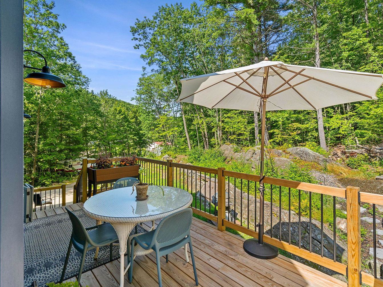 A wooden deck extends from the house, bordered by a rustic railing with vertical black balusters and natural wood handrails. An oval glass-top table anchors the space, surrounded by four modern blue chairs. A woven planter with green foliage acts as a simple centerpiece, while a large white patio umbrella casts generous shade over the seating. A rectangular planter box brims with greenery along the edge. Overhead, an industrial-style black and brass sconce adds a touch of vintage charm to the space. Lush green forest and visible rocky outcrops create a tranquil, secluded woodland setting with plenty of natural light.