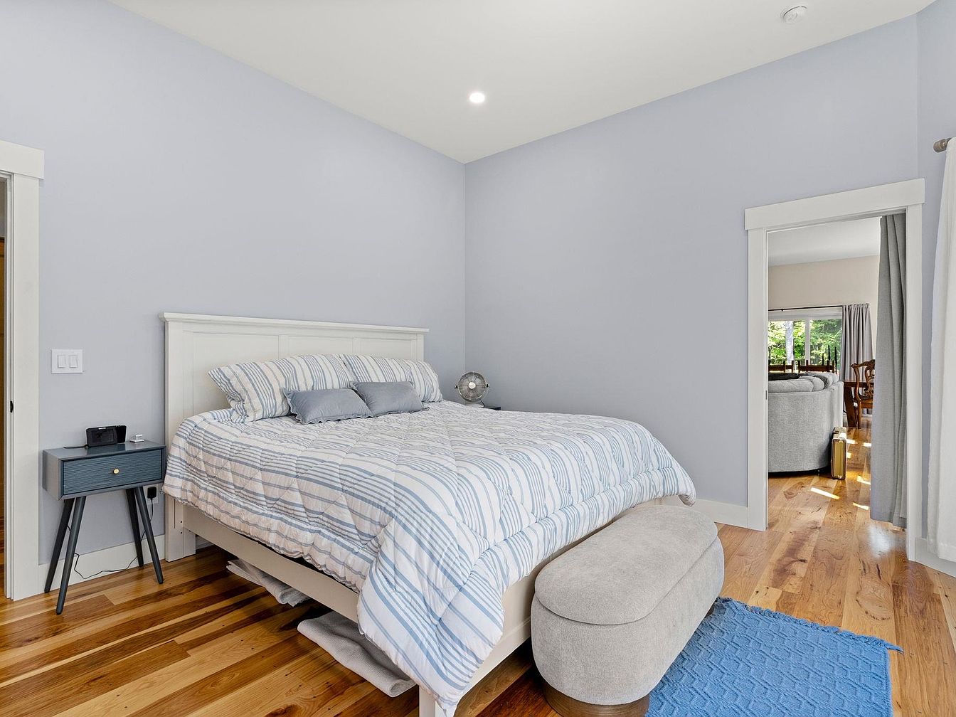 A cozy bedroom with soft blue-gray walls and natural wood flooring. The bed, centered against one wall, features a white headboard and is dressed in a striped comforter in shades of white and soft blue, complemented by matching pillows. At the foot of the bed sits a rounded upholstered ottoman in a light beige fabric. A small modern nightstand in blue-gray holds a clock and lamp. Doors lead to adjoining rooms, one of which reveals a glimpse of a comfortable living area with large windows and ample natural light, enhancing the fresh and tranquil feel of the space.