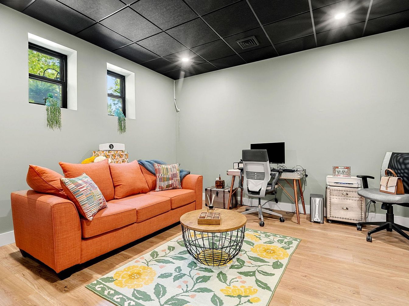 A cozy and modern workspace features an inviting burnt orange sofa with colorful patterned pillows, sitting against a pale sage green wall. The warm, light-toned wood floor anchors the space, complemented by a soft rug decorated with large yellow flowers and green leaves. Two small, rectangular windows with leafy potted plants provide natural light. The black drop ceiling adds a contemporary touch, as do the simple lines of the white desk and ergonomic office chair set across from the sofa. The area balances comfort and utility, blending lively color with uncluttered minimalism.