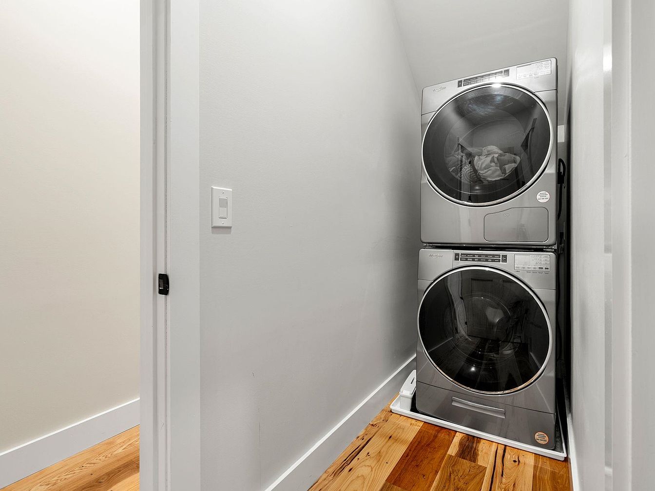 A compact laundry area is tucked into a narrow alcove, featuring a stacked washer and dryer with a sleek, metallic finish. The machines are positioned against a white wall, optimizing the vertical space in the small nook. The space feels bright and minimalist, thanks to the white walls and trim, which are contrasted by the room’s medium-toned hardwood flooring. A single light switch is visible on the left wall adjacent to the open door, and the clean, uncluttered atmosphere suggests an efficient, modern utility area designed for practicality within a confined layout.