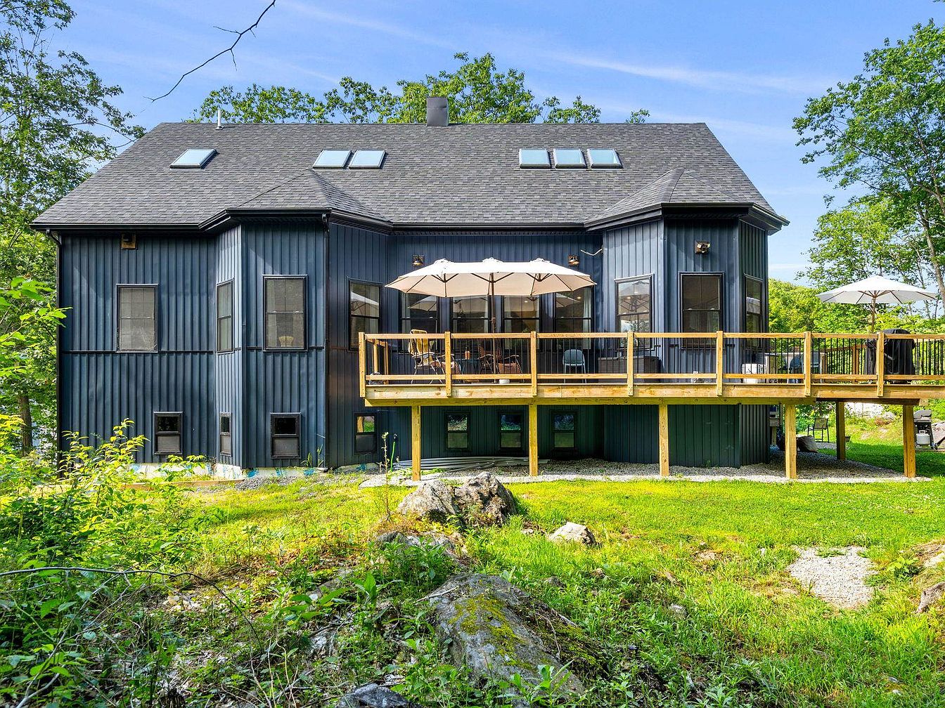 A two-story house with a modern, dark gray exterior is set against a lush, green landscape. The rear of the house features a spacious wooden deck raised above the ground, accessible by steps, and enclosed by a simple railing. Large windows punctuate the charcoal-blue siding, providing ample natural light inside. Two large patio umbrellas shade outdoor dining areas, offering space for relaxation and alfresco meals. Clean lines dominate the house’s architecture, complemented by a gabled roof with multiple skylights. The surrounding yard is natural, with rocks, patches of grass, and mature trees framing the home, emphasizing a serene, contemporary retreat.