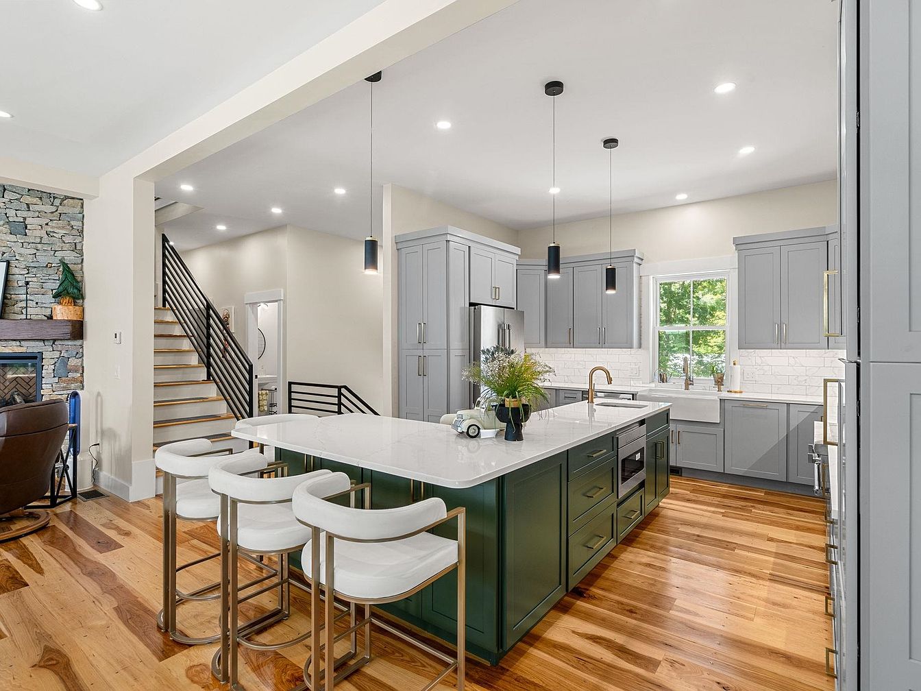 A spacious, modern kitchen featuring a large central island with a deep green base and white quartz countertop, surrounded by three white and gold barstools. The perimeter cabinetry is painted a soft gray with brushed gold hardware, topped by matching white counters and a white ceramic farmhouse sink under a window with bright leafy views. Sleek black pendant lights hang above the island. Light, natural wood floors bring richness and warmth, while a stone fireplace and open stairway with black metal railings are visible to the side. The overall palette is fresh, airy, and contemporary, blending elegance with cozy functionality.