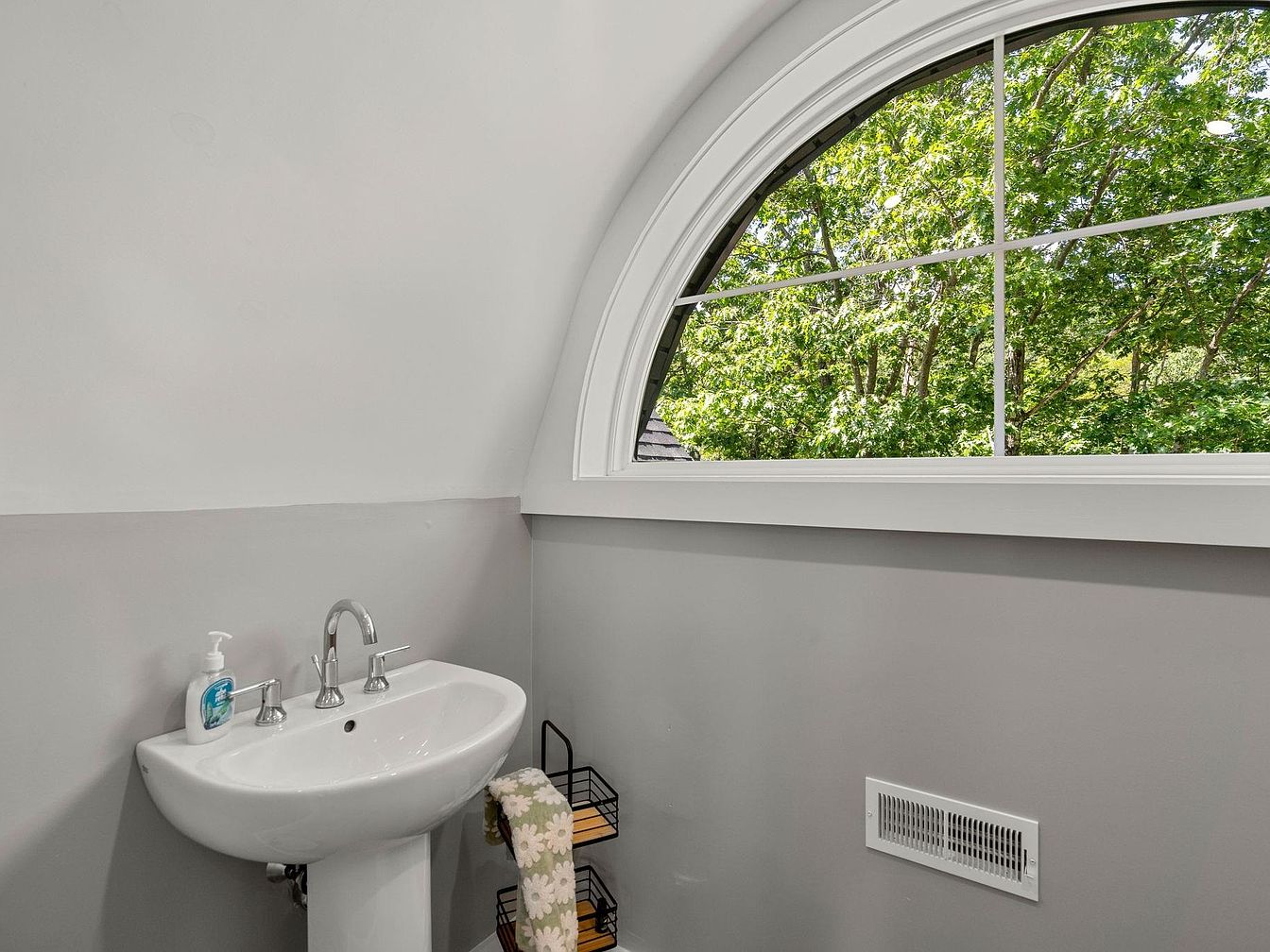 A compact bathroom nook featuring a sleek, white pedestal sink with a contemporary chrome faucet and handles. The wall is painted in calming shades of pale gray and white, creating a clean, modern look. Above the sink is a generous arched window with white trim, flooding the space with natural light and offering a scenic view of lush, green tree foliage outside. To the side of the sink is a minimalist black metal rack holding a floral-patterned hand towel. A small bottle of hand soap sits on the sink, and a discreet air vent is mounted on the wall below the window.