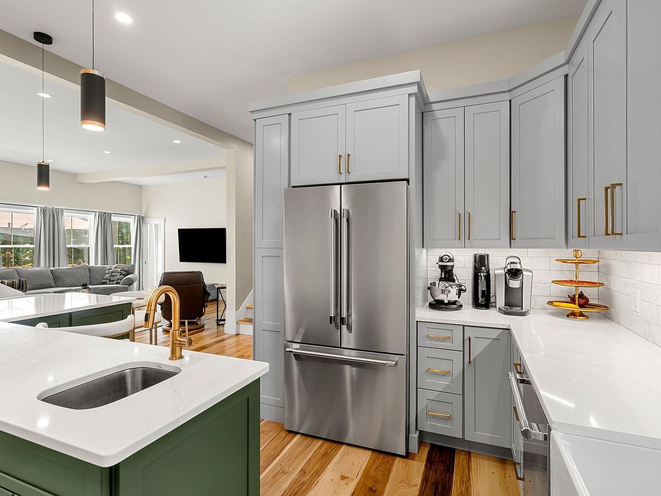 Open-concept kitchen and living space with a seamless flow between areas. The kitchen features light gray cabinetry with gold hardware, sleek stainless steel appliances including a large French door refrigerator, and white quartz countertops with a subtle marble effect. A green island with a white countertop and gold faucet adds a pop of color and elegance, complemented by modern black pendant lighting overhead. The backsplash is white with a subway tile pattern, creating a timeless look. Adjacent, natural light streams through large windows in the living area, which has neutral-toned walls, hardwood floors, a gray sectional sofa, and a mounted flat-screen TV.