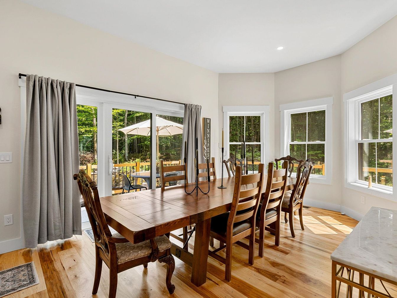 A spacious dining area with abundant natural light through three large corner windows and a set of sliding glass doors that lead to a deck outside. The room features a substantial, rustic wooden dining table surrounded by a mix of elegant, carved wood chairs and simpler ladder-back chairs. Pale neutral walls and warm, natural wood floors create a relaxing atmosphere. Light gray floor-length curtains frame the sliding doors, while a marble-topped console table sits to the right. The deck and greenery visible outside enhance the airy, nature-connected feel of this space, blending traditional and contemporary design elements.