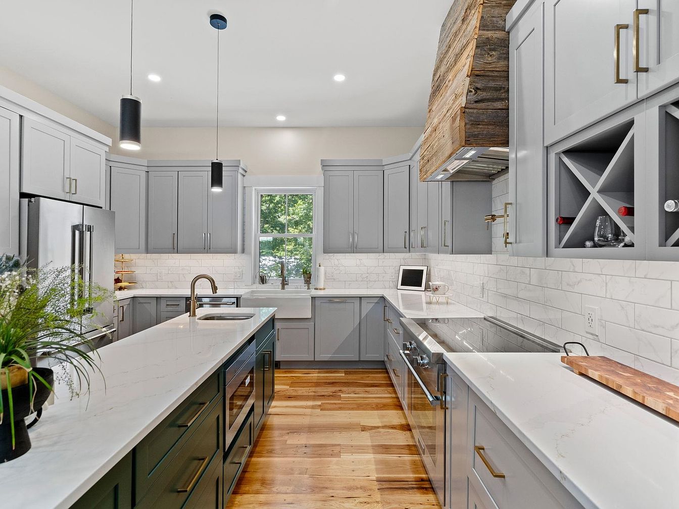 The kitchen features an L-shaped layout with soft gray shaker cabinets that extend up to the ceiling and are finished with sleek brass handles. White marble countertops and a matching white subway tile backsplash contrast beautifully with the cabinets. Modern stainless steel appliances include a large refrigerator, built-in oven, and microwave. A rustic wooden vent hood adds a touch of farmhouse charm above the stovetop. Open shelving and wine storage provide stylish organization options. The space is well-lit by recessed lighting and two contemporary black pendant lights above a large central island, which has a deep sink and decorative greenery. The floor is warm-toned natural wood, enhancing the inviting feel of the room.