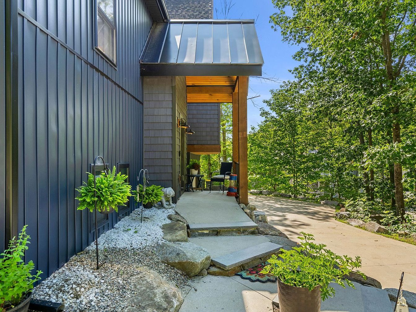 Stepping stones form a gentle, angular path leading to the covered front entry, flanked by large wooden posts. The left side features dark vertical metal siding and decorative shingle siding, creating a modern yet rustic impression. Potted ferns and other greenery sit along the path, with beds of white gravel and large rocks adding natural texture. To the right, a paved driveway curves away, surrounded by lush, mature trees that offer privacy and dappled sunlight. Black metal chairs and vibrant plant containers at the porch area make the space welcoming and serene, blending nature with contemporary architecture.