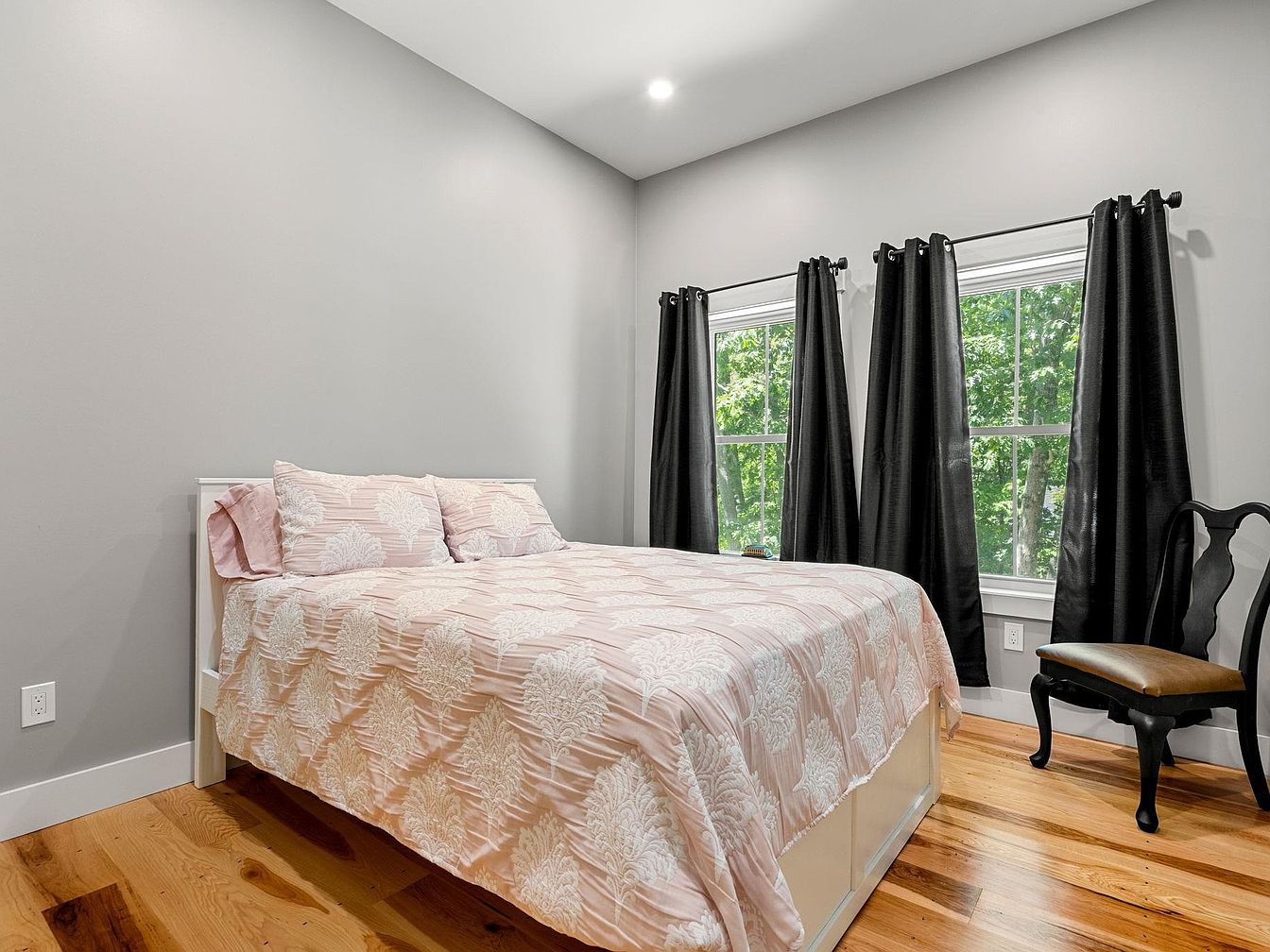 A serene bedroom with a light gray wall color and warm, polished wooden floors. A queen-sized bed with a pastel pink and white leaf-patterned comforter and matching pillows sits against the left wall. Two large windows at the end of the room let in natural light and frame the verdant greenery outside. Both windows have elegant black curtains, providing contrast to the softer hued walls and bedding. A classic black wooden chair with a tan seat sits beside the windows, and the overall decor is minimalist yet inviting, blending traditional and modern touches for a calm, restful atmosphere.