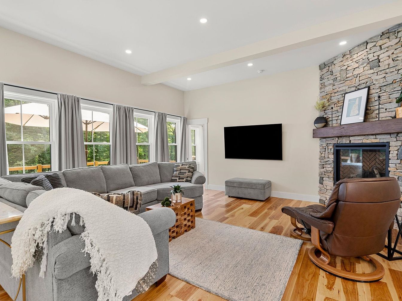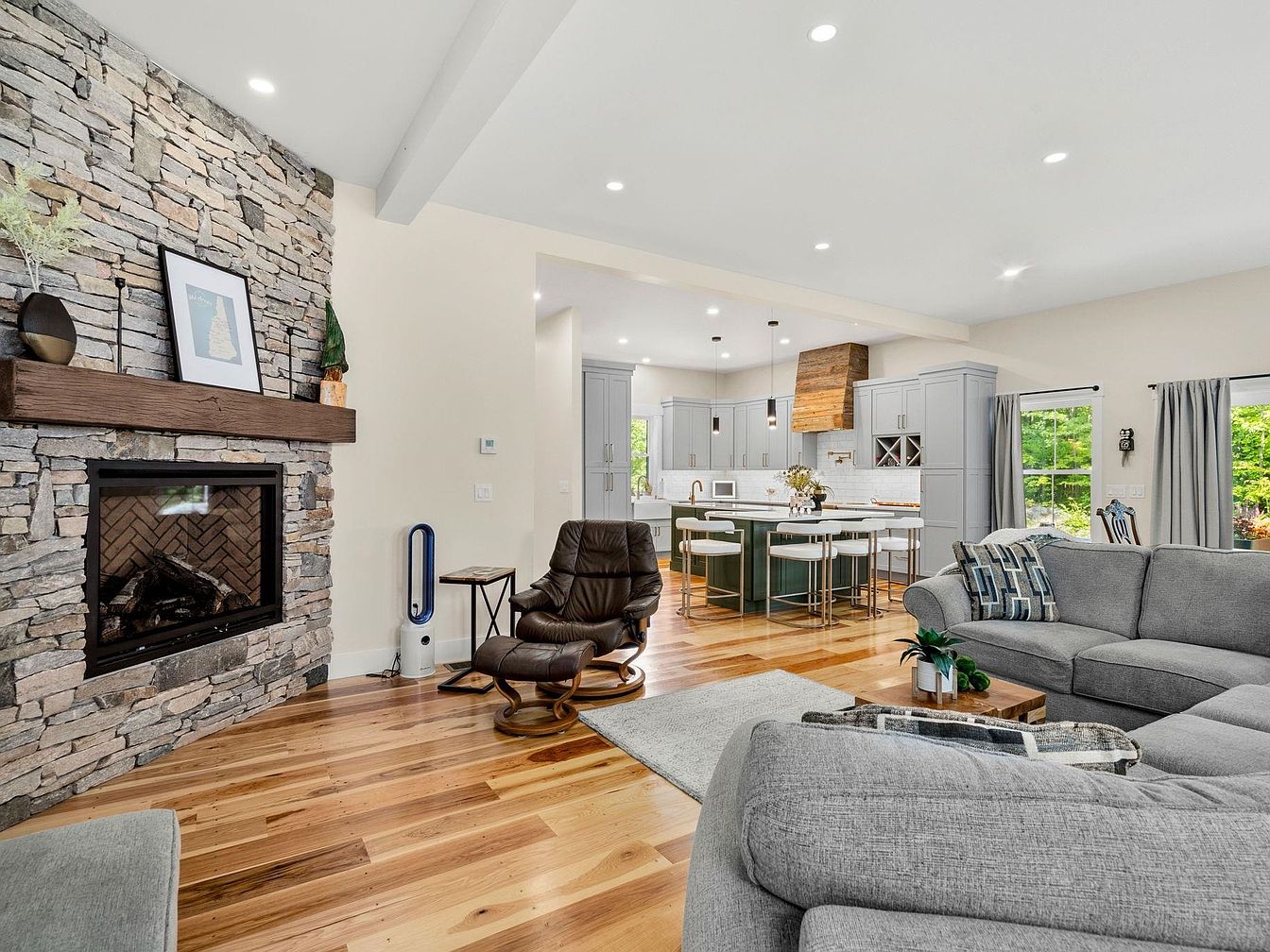 Open-concept living room seamlessly flows into the kitchen, unified by warm, natural wood flooring and cream-colored walls. The centerpiece is a striking stone fireplace with a chunky wood mantel adorned by simple decorative pieces. Plush gray sectional sofas with patterned cushions offer comfortable seating, while a modern brown leather recliner adds a cozy reading nook. Tall windows with soft gray curtains fill the space with natural light, offering views of lush greenery outside. The kitchen showcases pale gray cabinetry, pendant lights, and a central island with white bar stools, creating an inviting area perfect for gatherings and relaxed entertaining.