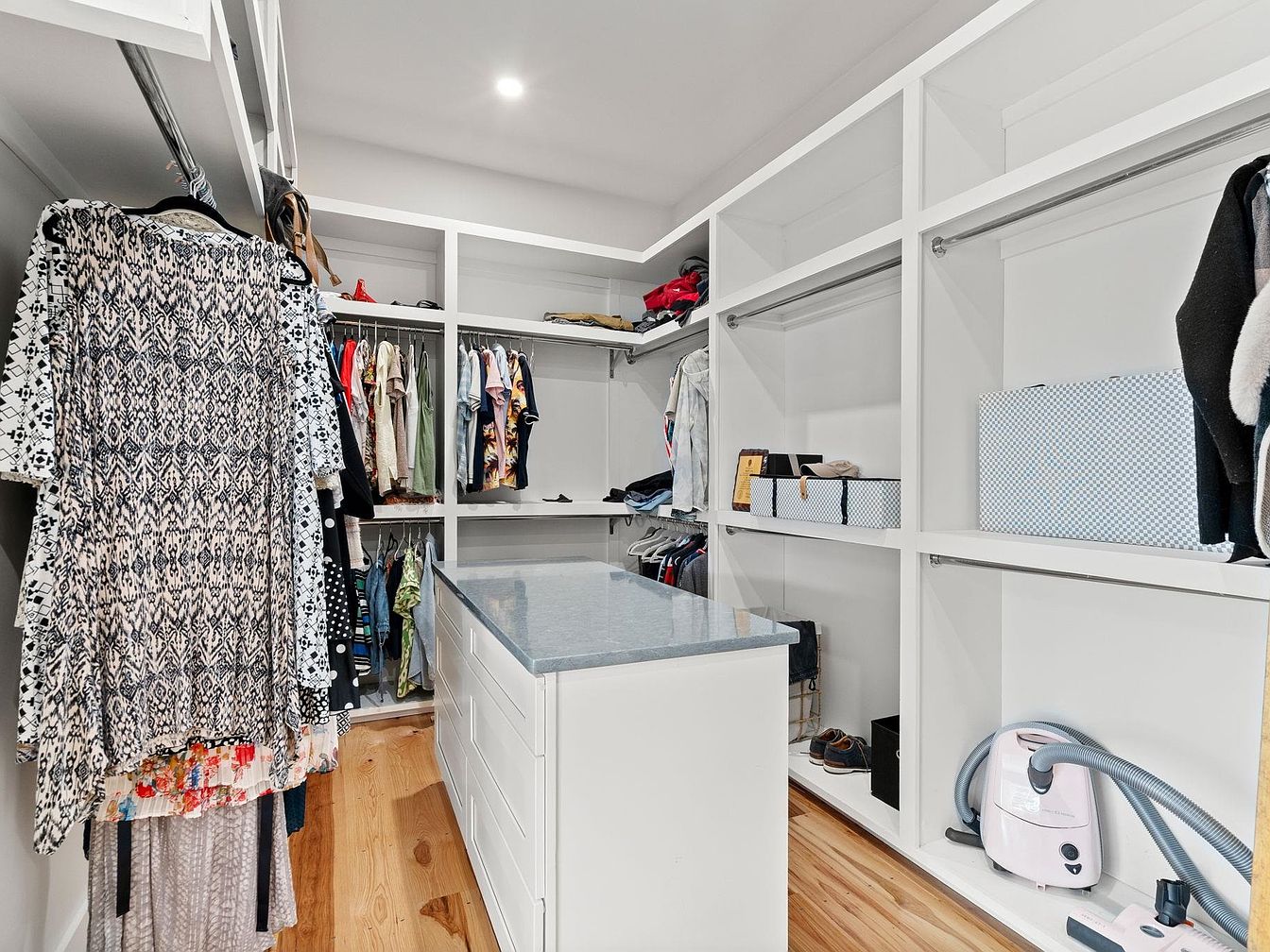Spacious walk-in closet with open white shelving units built into the walls, offering hanging racks and storage cubbies for clothes, accessories, and shoes. A large central island with drawers provides additional storage and a flat surface for folding garments. The space utilizes bright, even lighting and features a clean color palette of crisp white cabinetry paired with warm, natural wood floors. Clothing in neutral and patterned fabrics hangs neatly, and storage boxes with coordinated designs rest on shelves. The closet is tidy, functional, and designed for easy visibility and organization, with a modern, streamlined aesthetic.