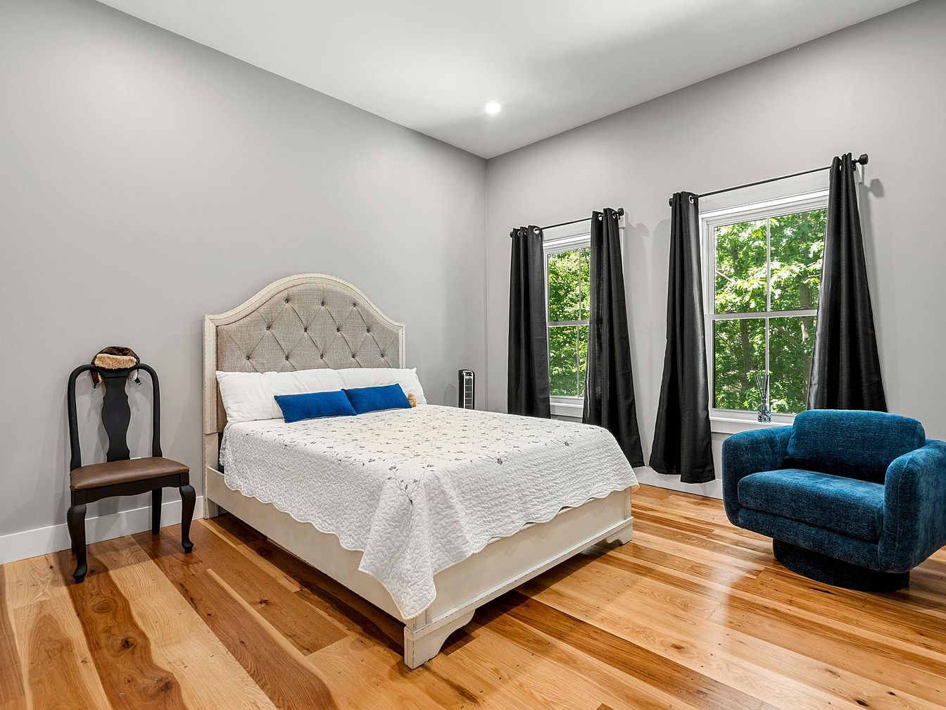 A serene bedroom featuring a queen-sized bed with a tufted, upholstered headboard stands against a light grey wall. The bedding is white with a subtle pattern and accented by navy and gold pillows. To the left of the bed, a vintage wooden chair with a curved back and cushioned seat sits. On the right, a plush, deep blue armchair adds a pop of color. Two tall windows framed by black curtains fill the room with natural light and offer views of lush greenery. The floor is polished, natural hardwood with distinctive grain patterns, complementing the modern yet cozy atmosphere.