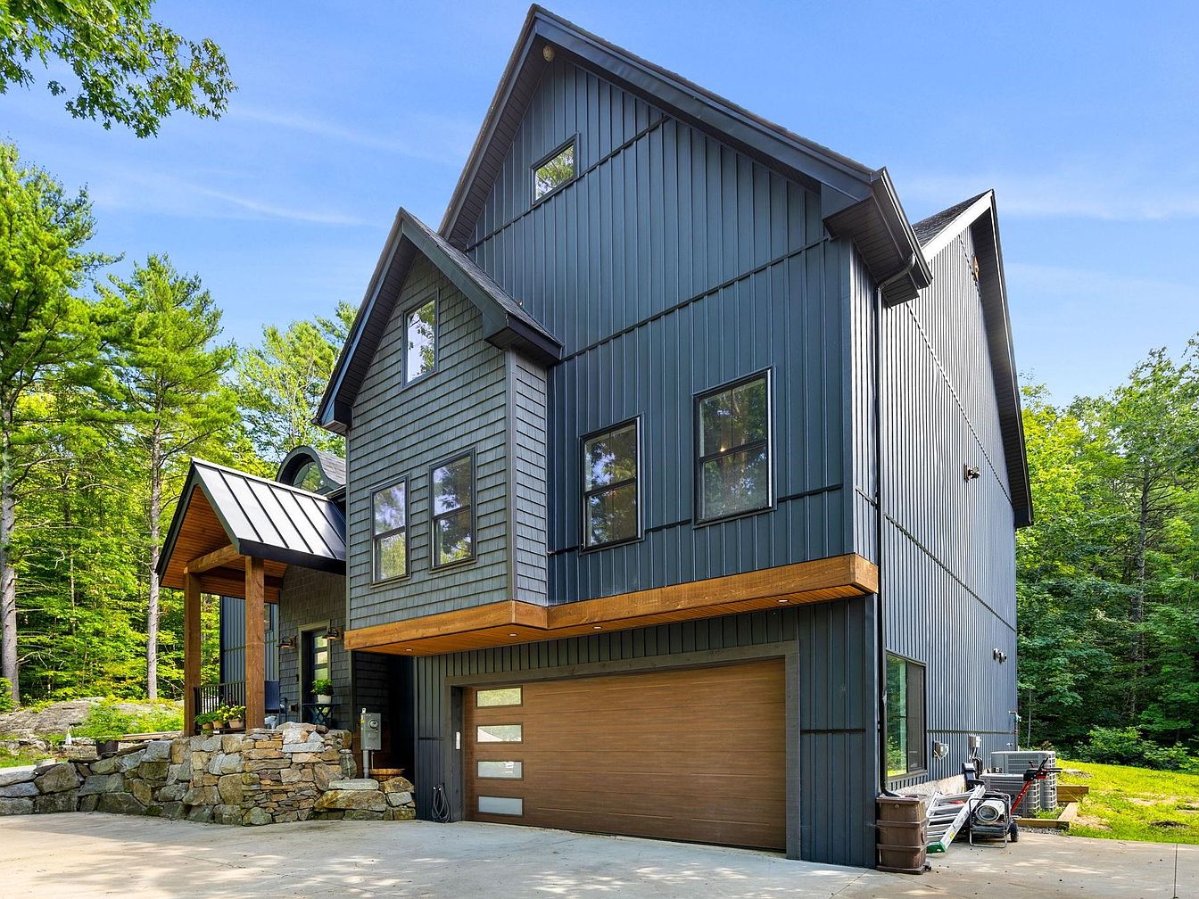 Located in Laconia, NH, minutes from Lake Winnipesaukee and Lake Winnisquam, this custom-built home sits on 5 private acres and spans over 4,000 sq ft with 5 bedrooms and 5 bathrooms. While embracing the modern farmhouse style with a blend of craftsman elements—seen in its exposed wood, dark board-and-batten siding, and eyebrow windows—this residence boasts contemporary features and quality materials. The first floor is graced by hickory wood floors and a striking granite fireplace, while a gourmet kitchen with quartz countertops serves as the heart of the home. Renovated with luxury and comfort in mind, highlights include two primary suites, a finished lower level with a theater, and a wrap-around deck. Listed at $1,124,000, it is ideal for both year-round living and investment.