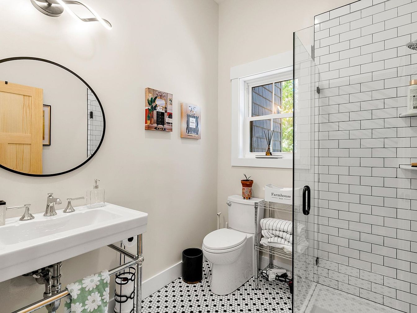 A bright and clean bathroom features a white porcelain sink with chrome legs and fixtures, set against a soft cream wall. Above the sink is a large round mirror with a thin black frame, and a modern wave-shaped silver light fixture provides illumination. The flooring is hexagonal black-and-white tile, which coordinates with the white subway-tiled shower set behind a clear glass door with black hardware. A toilet sits beneath a window with a white frame, complemented by a compact wire shelving unit stocked with towels and toiletries. Small, colorful art pieces add a playful touch to the minimalist decor.