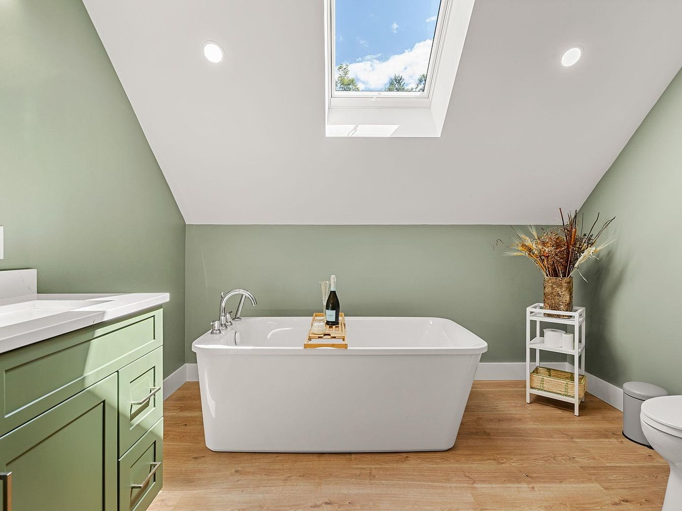 A serene bathroom features a freestanding white bathtub centered beneath a large skylight, allowing natural daylight to pour in. The space is accented by soothing sage-green walls and sloped ceilings, adding a cozy yet airy atmosphere. To the left, a vanity with paneled cabinetry painted in a soft green harmonizes with the wall color. The light wood flooring adds warmth and a touch of rustic charm. A small white side table holds a vase filled with dried flowers, enhancing the organic, tranquil feel. Bright recessed lighting and minimal, tasteful decor complete this inviting modern retreat.