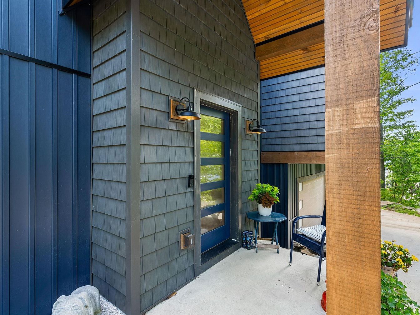 A compact covered porch welcomes visitors with a blend of modern and rustic design. The exterior is clad in gray square shingles and dark vertical siding, contrasted by warm natural wood trim supporting the overhang above. A glass-paneled door allows light to filter into the entry. Two black wall sconces frame the door, adding symmetry and a soft glow. A small, round, blue accent table is topped with a leafy green potted plant, paired with a navy-blue woven chair featuring a patterned seat cushion. Pops of yellow from potted flowers add cheer, while the surrounding lush greenery hints at a wooded setting.