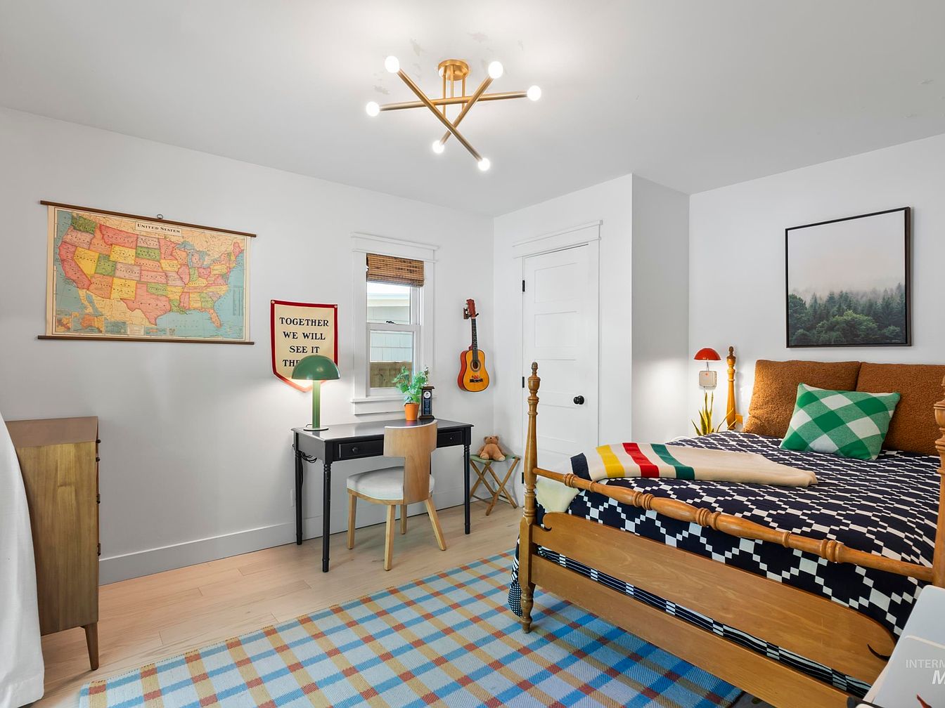 A cozy bedroom vibrant with a mix of old and new elements. A wooden bed frame features turned posts and is dressed with a bold patterned quilt in navy, white, and shades of green. A prominent map of the United States adorns the wall, complemented by a whimsical poster stating, “Together We Will See This.” The color palette blends soft whites, light wood tones, and playful patterns. A sleek black desk sits adjacent to a round wooden chair, illuminated by a green desk lamp. Warm textures are introduced through decorative pillows and a checkered area rug, enhancing the inviting atmosphere.