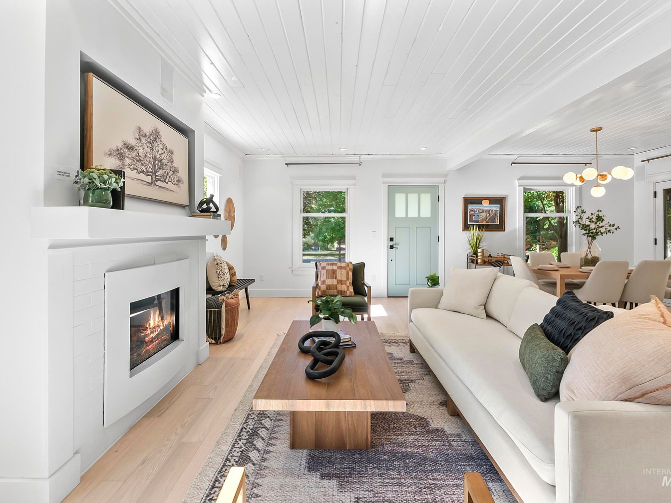 This cozy living room embraces a modern yet inviting aesthetic. A white shiplap ceiling reflects natural light, paired with soft oak flooring that adds warmth. The centerpiece features a sleek, minimalist fireplace with a rectangular facade, surrounded by decorative elements like a framed tree print, tasteful greenery, and abstract sculptures. A comfortable, light-colored sectional sofa provides ample seating, adorned with textured throw pillows. A wooden coffee table rests on a patterned area rug, enhancing the room’s charm. Large windows invite the outdoors in, and a light teal front door adds a refreshing touch to the open layout.