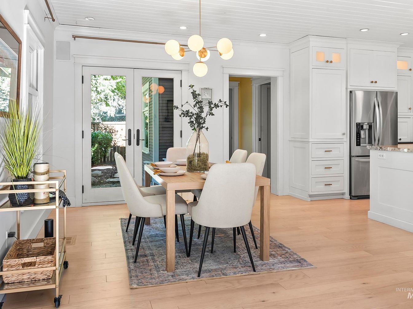 A modern dining area adorned with a light wooden table paired with stylish cream chairs, creating a welcoming atmosphere. Natural light streams through large glass doors, framing a view of the outdoor garden space. The ceiling features crisp white paneling, enhancing the room’s airy feel. A decorative area rug adds warmth beneath the table, while a contemporary chandelier with round, glowing bulbs punctuates the ceiling. To the side, an elegant cart holds decorative items, including plants and candles, contributing to the lush, vibrant aesthetic. Sleek cabinetry and stainless steel appliances are visible, emphasizing practicality and elegance.