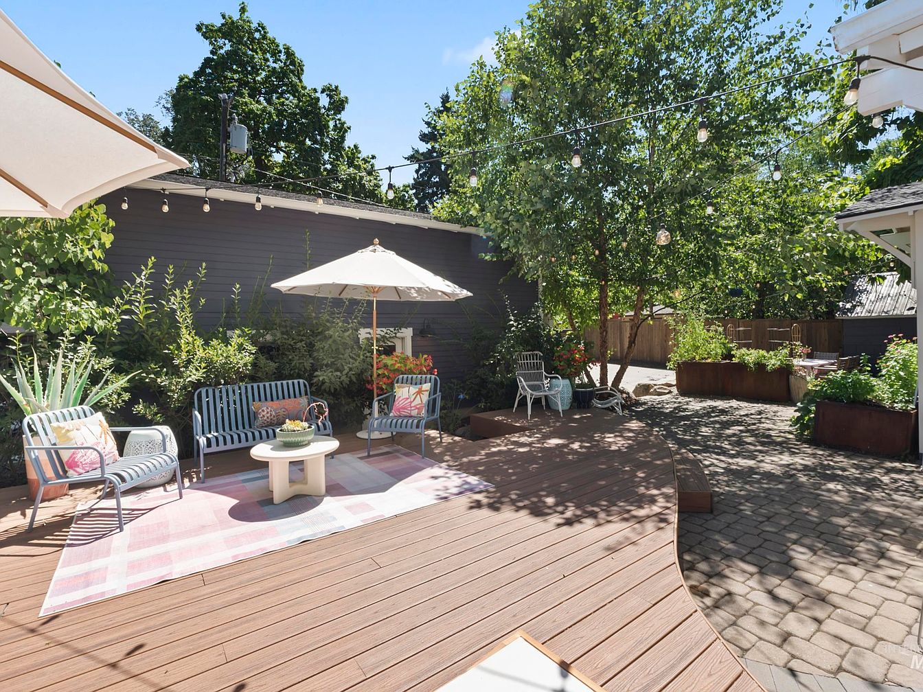 The outdoor patio features a spacious wooden deck that curves elegantly, providing a smooth transition to the stone-paved area. White lounge chairs with colorful cushions invite relaxation, while two generous umbrellas offer shade. An assortment of potted plants adds lush greenery, enhancing the natural ambiance. A large wooden table stands as a centerpiece, surrounded by vibrant floral arrangements. The exterior of the house is painted a deep gray, which contrasts beautifully with the earthy tones of the deck and interlocking pavers. String lights overhead create a warm, inviting atmosphere, perfect for evening gatherings.
