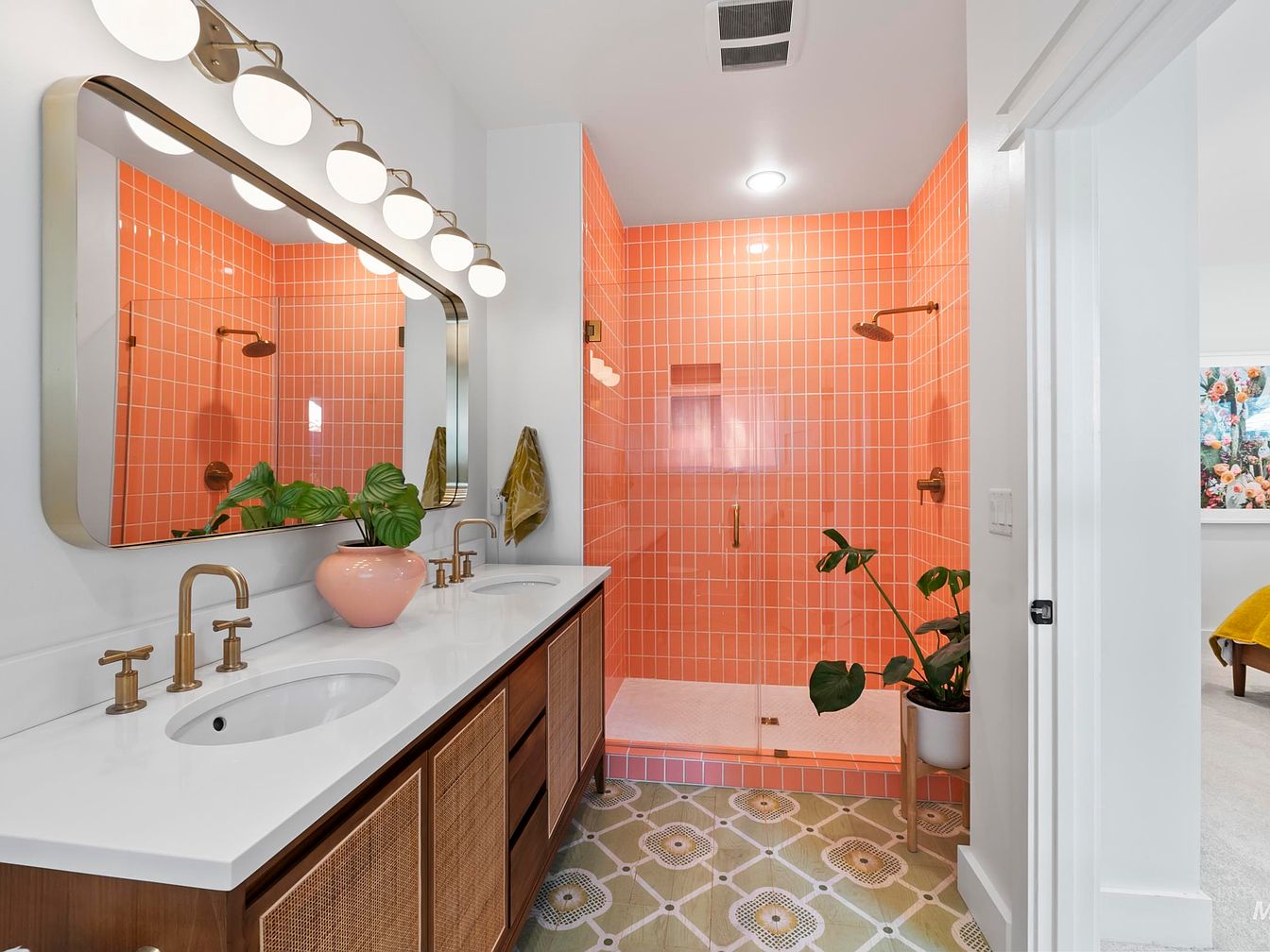 This vibrant bathroom features a striking backdrop of coral-colored tiles, creating a lively atmosphere. A spacious double vanity with a smooth white countertop is paired with rich wooden cabinetry that adds warmth. Above, a stylish mirror is illuminated by circular sconces, enhancing the space with modern flair. The shower area, enclosed with clear glass, showcases the same colorful tile, complemented by sleek gold fixtures. Decorative plants breathe life into the space, while the patterned floor tiles introduce a playful yet harmonious element. Overall, the design brilliantly blends contemporary aesthetics with a touch of natural freshness.