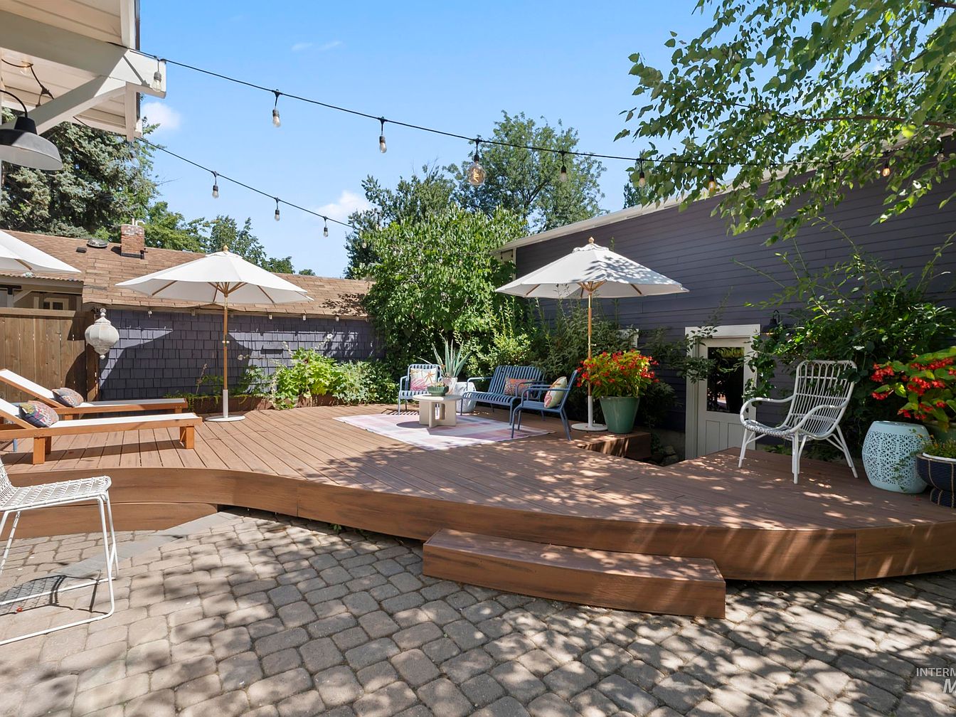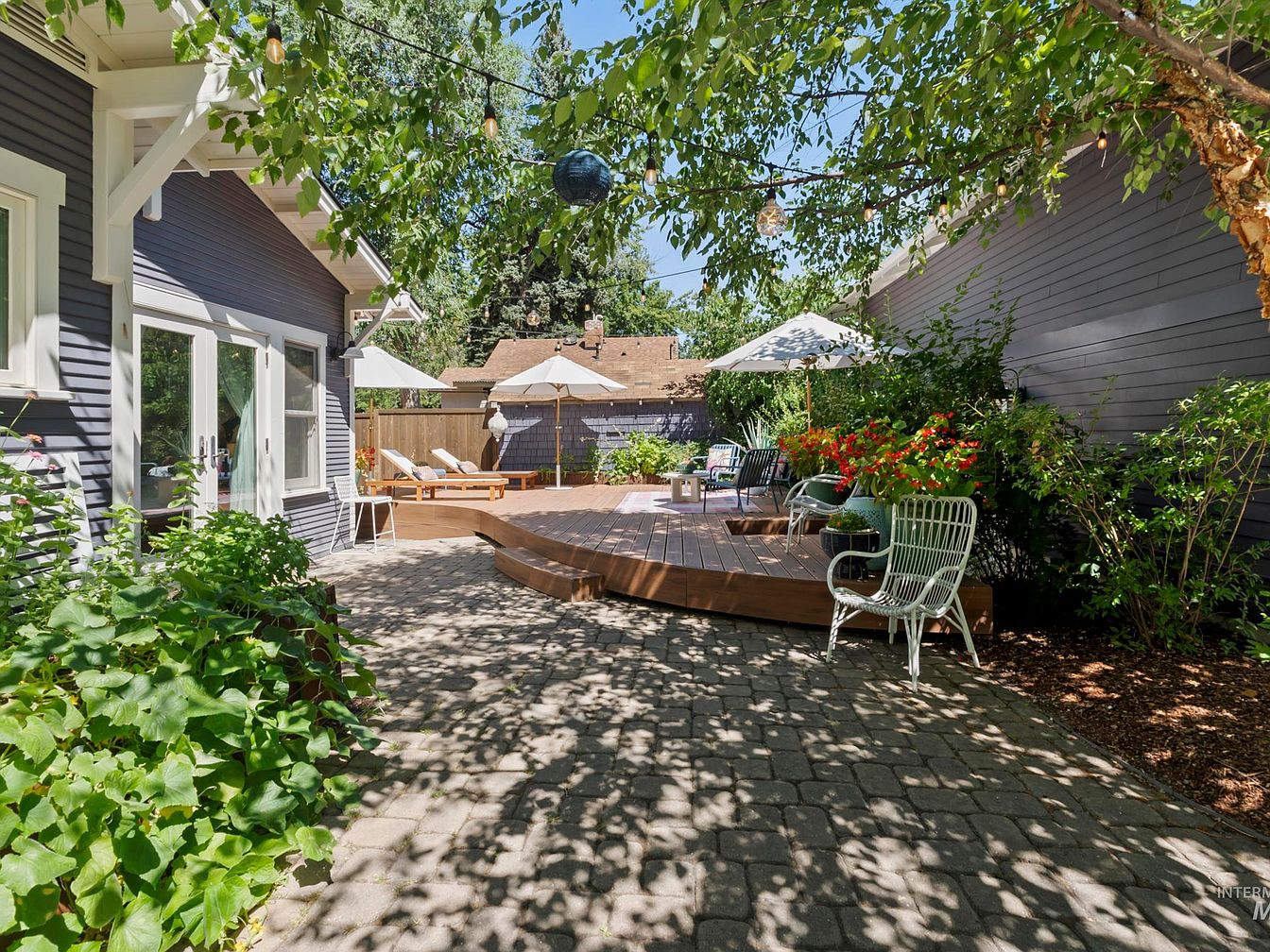 The patio features a charming blend of natural and built environments. A wooden deck with a smooth finish curves elegantly, surrounded by vibrant flower beds that add splashes of color. Large umbrellas provide shade over lounge chairs, perfect for relaxation. The ground is paved with rectangular stones, forming a patterned walkway that enhances the outdoor aesthetic. Lush greenery creates a sense of privacy, while string lights suspended from above hint at evening gatherings. The house’s gray siding complements the surroundings, and the overall atmosphere conveys a serene, welcoming space for socializing or quiet reflection.