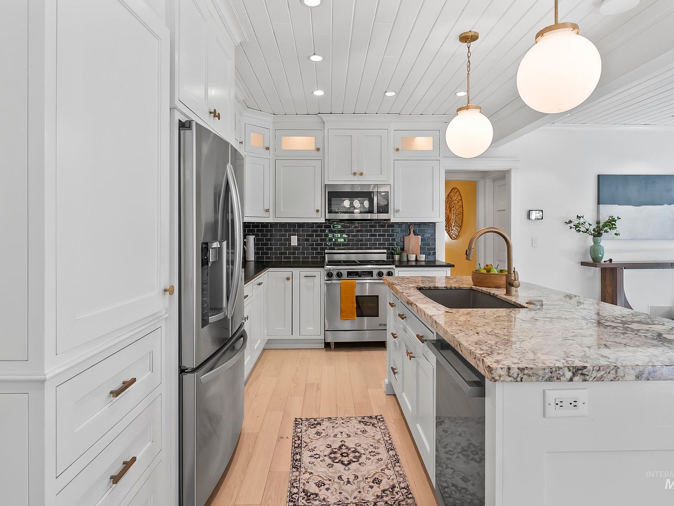 This modern kitchen features a clean, white cabinetry layout complemented by elegant gold hardware. A large kitchen island with a stunning granite countertop serves as a focal point, juxtaposed with an under-mounted sink. The backsplash of glossy black tiles adds a contemporary touch against stainless steel appliances, including a sleek refrigerator and range. Soft, warm woods in the flooring contrast beautifully with the white elements. Two stylish pendant lights hang overhead, illuminating the workspace. An inviting area rug beneath the island introduces a hint of warmth and texture, seamlessly blending practicality with contemporary design.