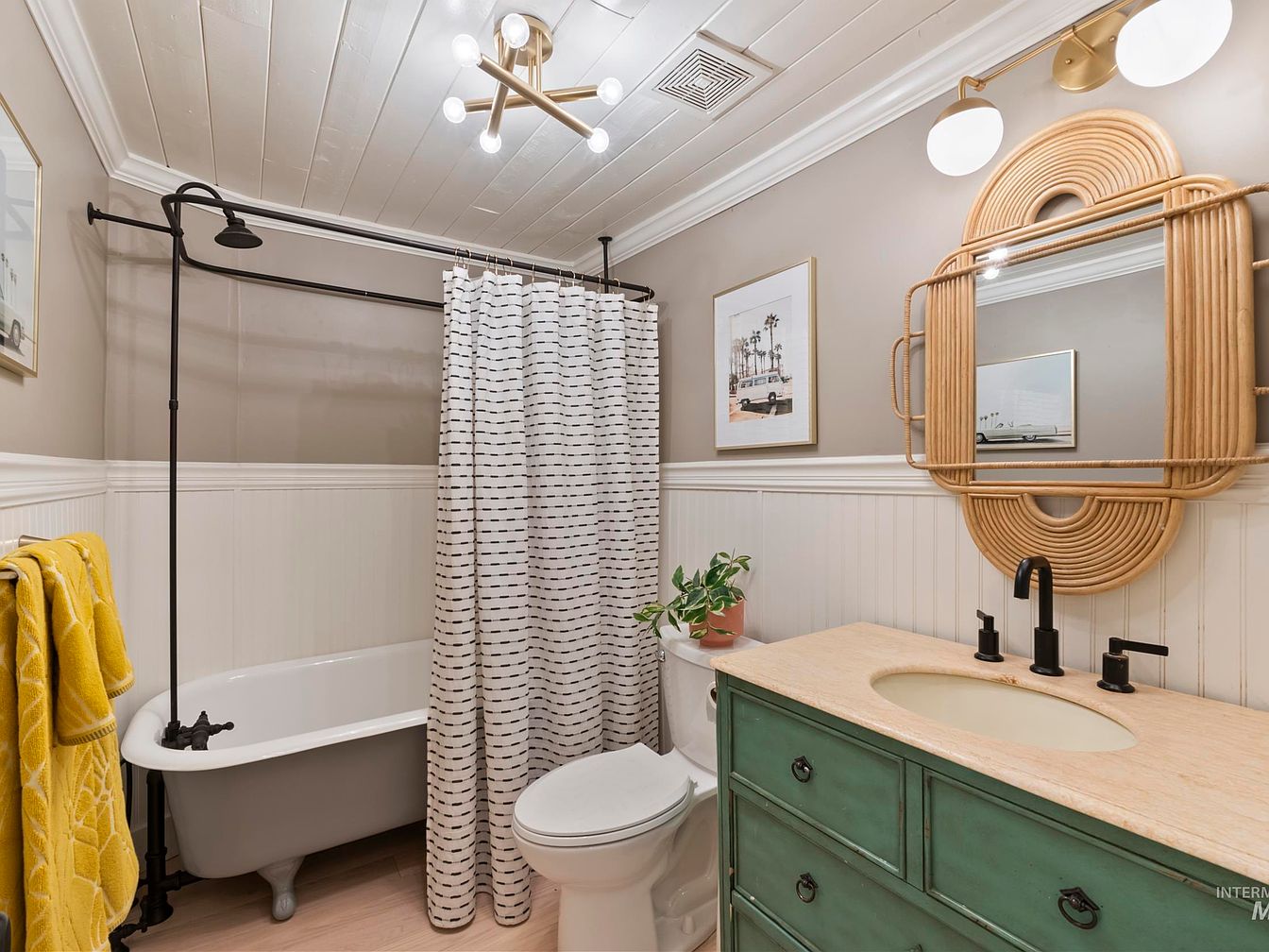 A cozy bathroom featuring a vintage-style freestanding bathtub with claw feet, flanked by a black shower curtain rod supporting a patterned shower curtain. The walls are painted in a warm, neutral taupe, complemented by white wainscoting. A striking green vanity with a natural stone countertop holds a circular sink and stylish black faucets. Above the vanity, a large, intricately woven mirror frames the space, while a simple light fixture adds contemporary flair. Bright yellow towels add a pop of color to the design. Two framed pictures adorn the walls, enhancing the aesthetic with subtle artistic touches.
