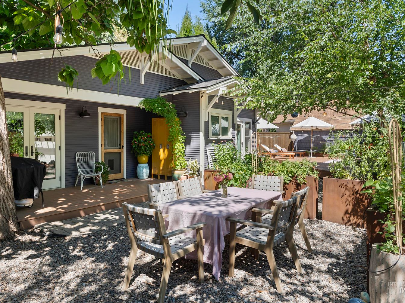 This outdoor patio features a cozy dining set with a light purple tablecloth draped over a wooden table, surrounded by stylish wooden chairs. The space is bordered by vibrant greenery and planters, adding a lush feel. A yellow door adds a cheerful pop against the deep blue-gray siding of the house, complemented by white trimming and multiple windows that invite natural light. String lights hang overhead, enhancing the inviting atmosphere. In the background, a shaded area with lounge chairs and umbrellas offers a relaxing retreat, merging functionality with aesthetics in this serene outdoor setting.