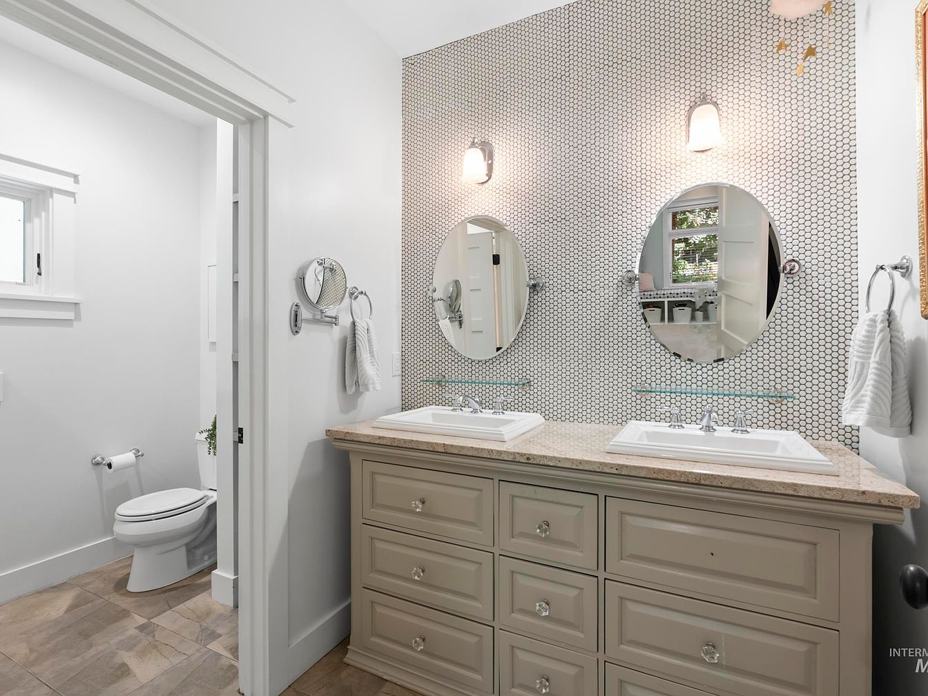 This modern bathroom features a spacious layout with a dual sink vanity centered against a backdrop of elegant hexagonal mosaic tiles. The light gray cabinetry, complemented by a speckled beige countertop, adds warmth and sophistication. Above the sinks, two round mirrors are framed in chrome, reflecting the soft glow of wall-mounted sconces. The color scheme is primarily white with subtle contrasts from the tiles and cabinets, ensuring a bright and fresh atmosphere. On the left, a discreetly positioned toilet and window create a functional yet aesthetic division, enhancing the bathroom’s overall inviting feel.