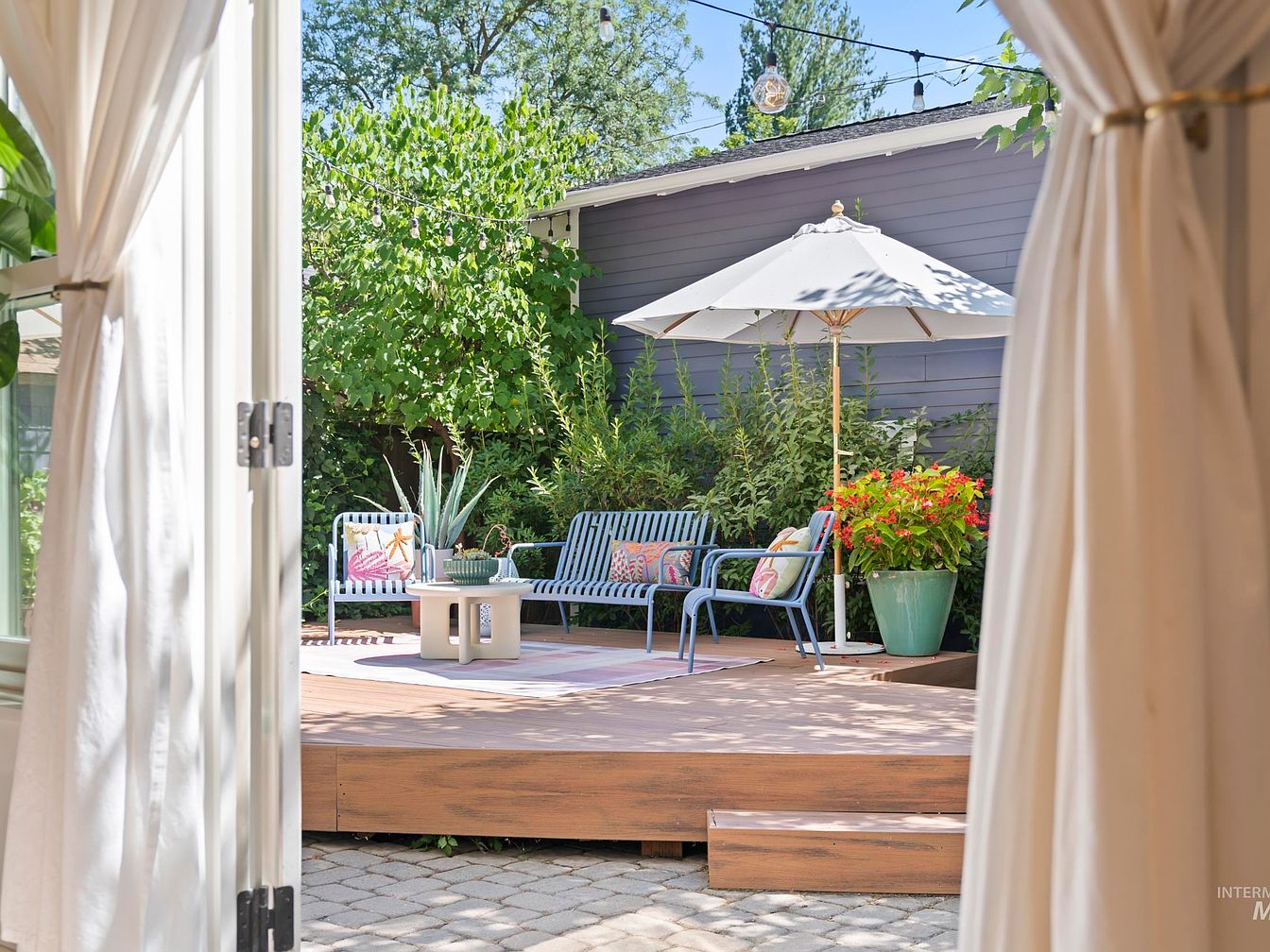 A serene backyard patio features a warm wooden deck surrounded by lush greenery. Sleek blue metal sofas with vibrant cushions invite relaxation, accentuated by a round white table at the center. A white umbrella provides shade, complementing the colorful flower pots that add vibrancy. The soft sunlight filters through the leaves, casting a calming glow on the space. Pebbled paths lead to the patio, enhancing the natural feel. String lights overhead create a cozy ambiance, perfect for evening gatherings. This outdoor area harmonizes modern design with nature, creating an inviting retreat for leisure and enjoyment.