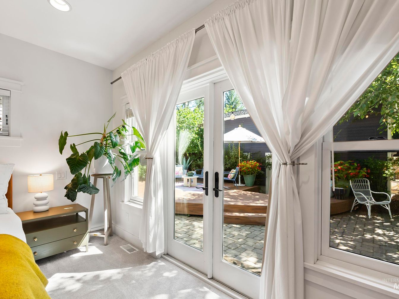 A serene bedroom corner highlighted by large glass doors leading to a patio. The interior features bright white walls and soft gray carpeting, creating a light and airy atmosphere. A complemented color scheme with a mustard yellow throw adds warmth. A modern bedside table in olive green hosts a sculptural lamp, providing gentle illumination. Lush green foliage in a ceramic planter introduces a natural element, enhancing the space. Outside, a well-arranged patio is visible, adorned with vibrant flowers and comfortable seating, inviting relaxation and outdoor enjoyment, blending indoors with the tranquil charm of nature.