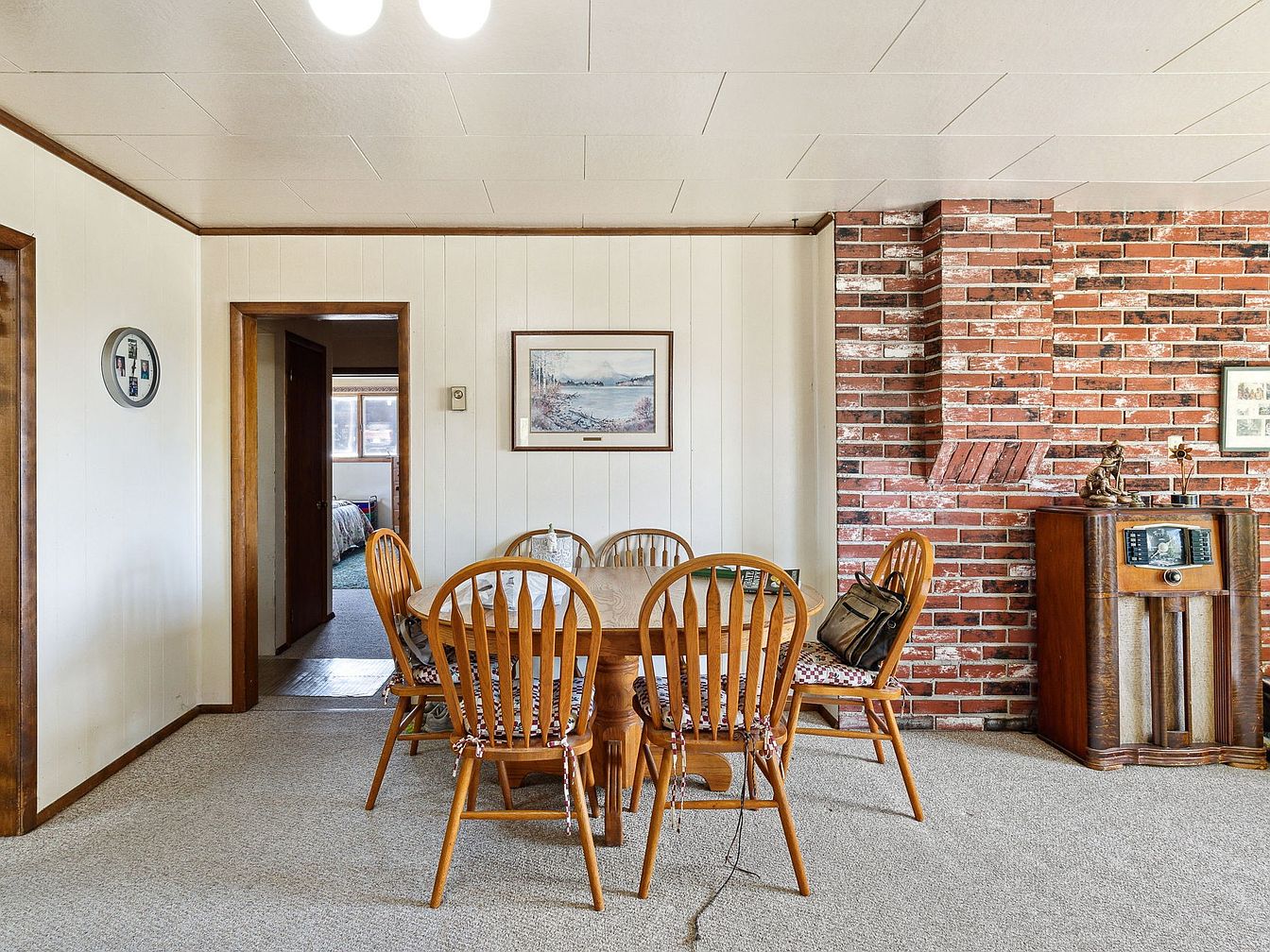 The dining area features a round wooden table surrounded by six classic spindle-back chairs, enhancing a cozy ambiance. The walls showcase white paneling accented by wooden trim, which contrasts beautifully with the rustic red brick fireplace in the corner. A framed landscape artwork hangs above the table, complementing the natural tones. A small vintage radio stands next to the fireplace, evoking a nostalgic charm. Soft beige carpeting adds warmth to the space, while the overhead lighting casts a gentle glow, making this area inviting for family gatherings and meals. The layout promotes seamless interaction with adjoining rooms.