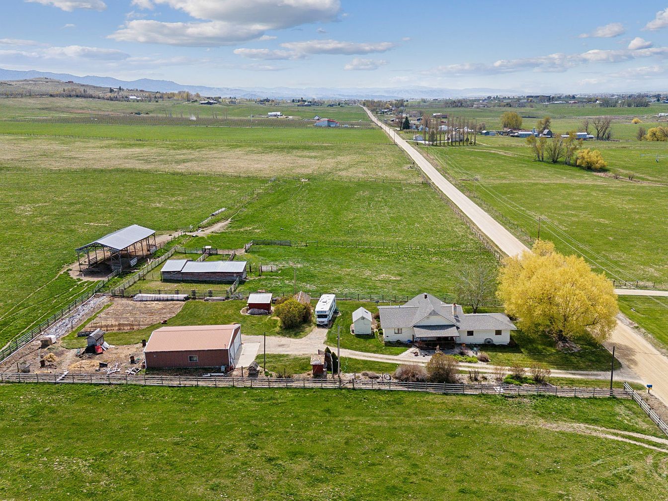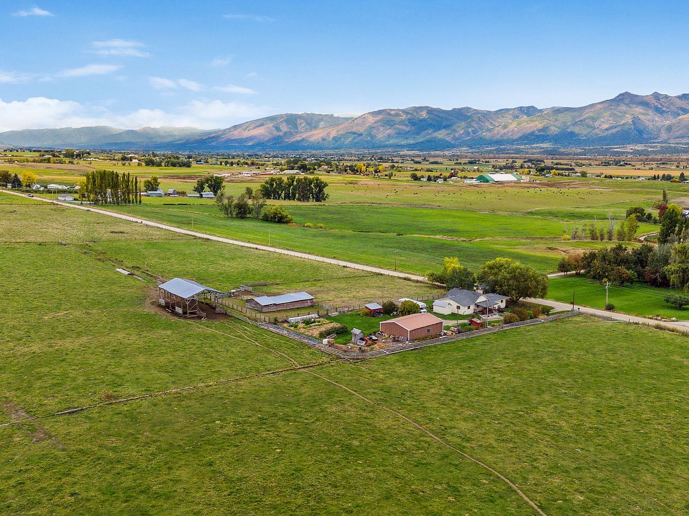 This aerial view captures a sprawling landscape featuring a historic American home set against a vast expanse of lush green fields. The property showcases a charming, single-story structure with a gabled roof and light-colored exterior. Surrounding the home are several outbuildings, including a barn with a metal roof and smaller sheds, all nestled within a fenced area. A tree with vibrant yellow foliage stands out, adding a splash of color. A dirt road runs alongside the property, enhancing the rural ambiance, while distant mountains and farms stretch along the horizon, creating a serene, pastoral scene.