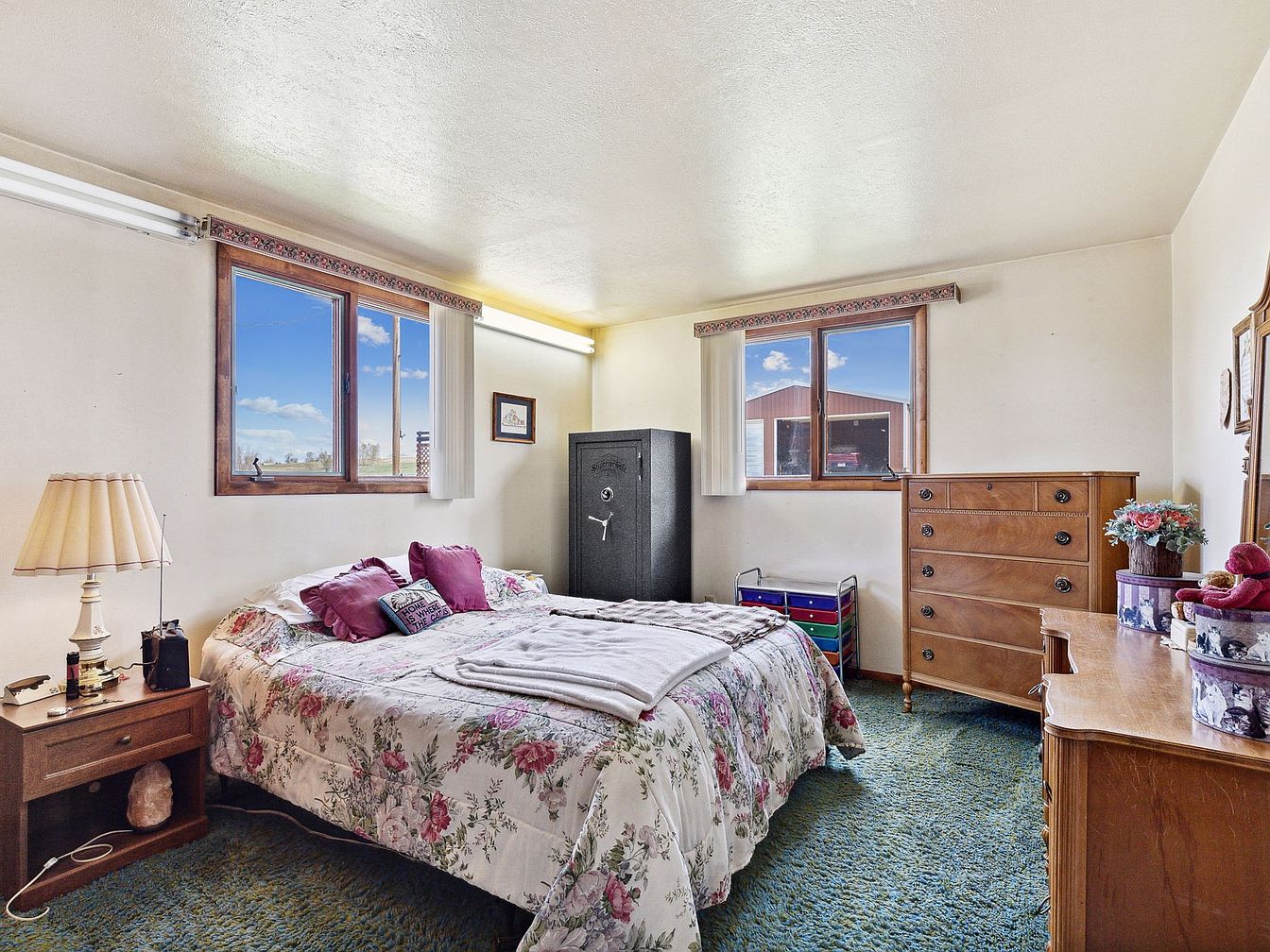 This bedroom features a cozy layout with a queen-sized bed adorned with a floral-patterned comforter and plush pillows. The walls are predominantly a soft cream, enhancing the warmth of the space. Natural light floods through two large windows, offering picturesque views outside. A nightstand with a classic lamp sits beside the bed, while a wooden dresser, characterized by its vintage appeal, stands against the wall. A black safe adds a functional yet unobtrusive element to the decor. The carpet is a vibrant turquoise, contrasting beautifully with the muted color tones of the room, creating an inviting atmosphere.