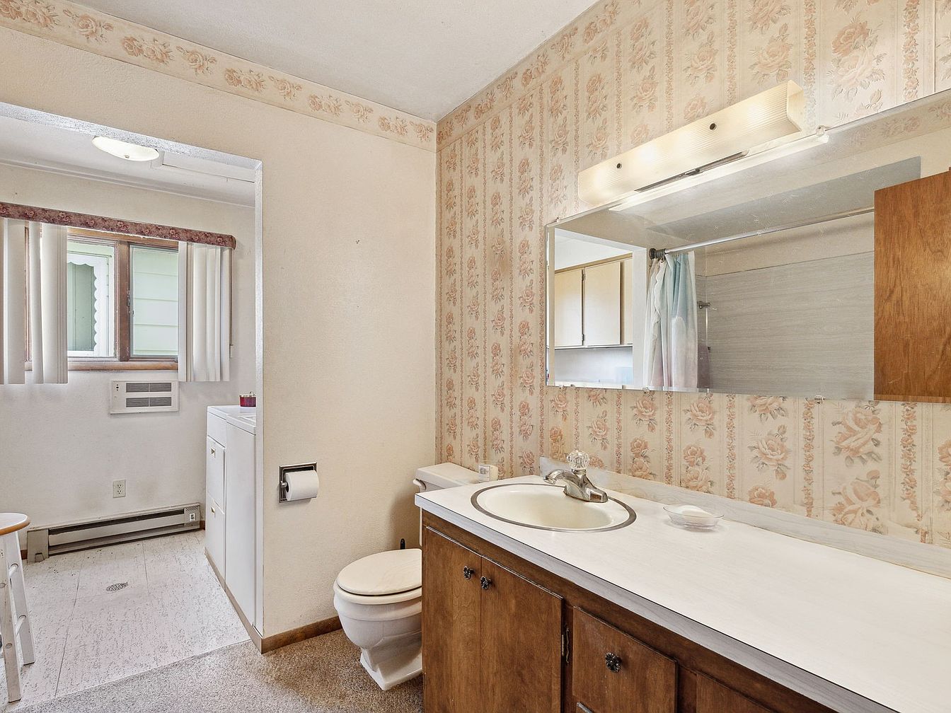The bathroom features a vintage aesthetic with light floral wallpaper adorning the walls, evoking a warm and nostalgic ambiance. A large mirror above the sink enhances the room’s brightness, complemented by a sleek, modern light fixture. The cabinetry is simple yet functional, with rich wooden tones providing contrast against the light-colored countertops. A white toilet is positioned next to a small window that allows natural light to enter, framed by soft fabric blinds. The flooring is a light, textured material, creating continuity with the decor while adding subtle visual interest.