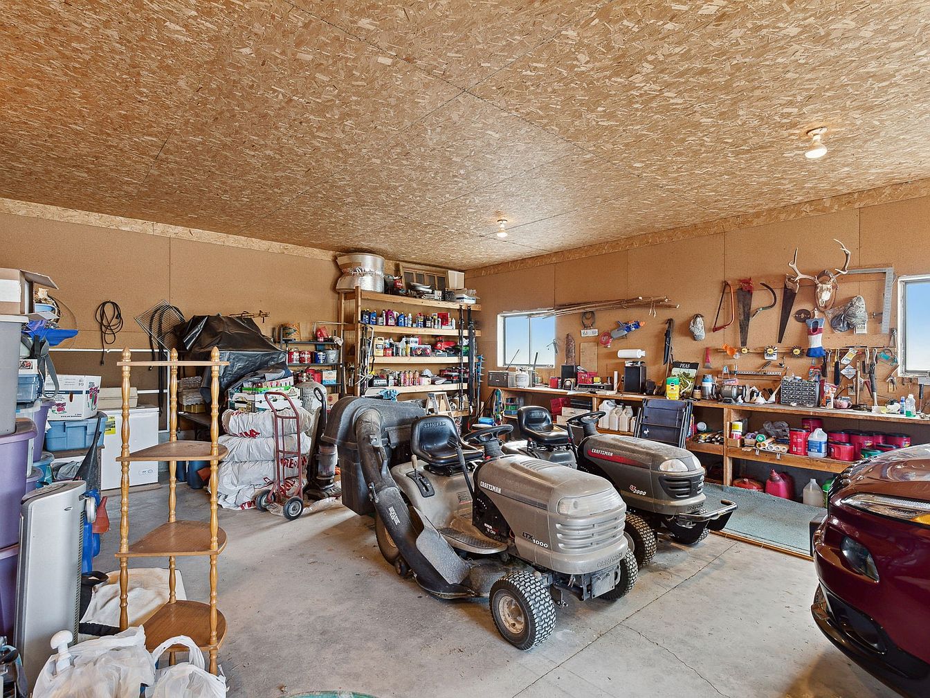 A spacious garage with a functional layout, showcasing two riding lawn mowers positioned prominently on a concrete floor. The walls are adorned with various tools and equipment, organized on long shelves laden with bins, paint cans, and other supplies. Natural light filters in through two large windows, illuminating the neutral-colored walls. The ceiling, made of textured plywood, adds an industrial touch. A wooden ladder-style shelf stands in one corner, adding height and additional storage while the overall atmosphere conveys a practical yet chaotic blend of utility and domestic life.