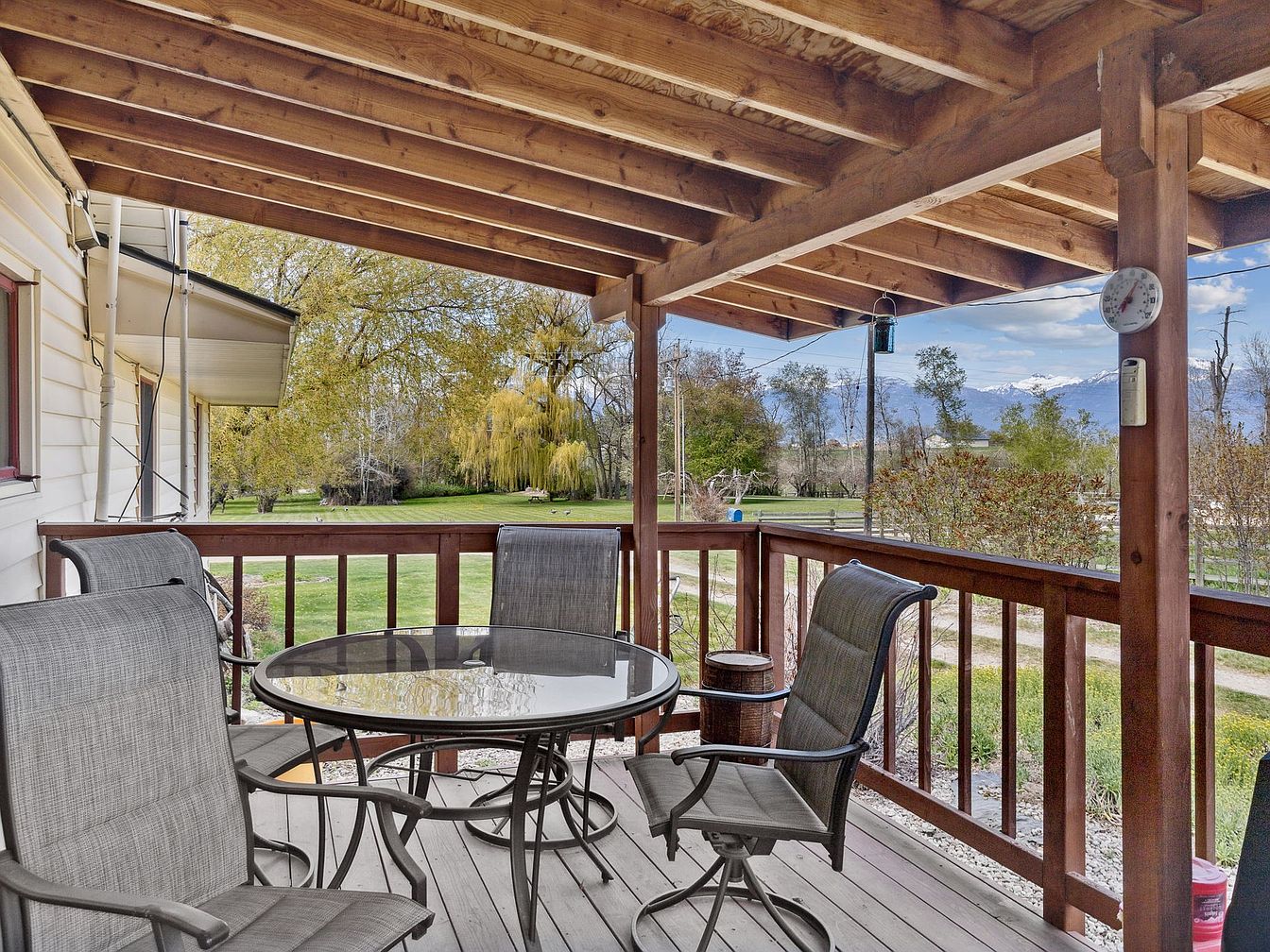 A spacious covered porch showcases a round glass tabletop accompanied by four metal-framed chairs with cushioned seats. The flooring is wooden, creating a warm and inviting atmosphere. The beautiful ceiling features exposed wooden beams, enhancing the rustic charm. Surrounding the porch, lush green grass stretches into the distance, complemented by blossoming trees. A thermometer hangs on one of the posts, adding a practical touch. The tranquil mountains are visible in the background, contributing a scenic backdrop. Soft natural light filters through, creating a serene outdoor space perfect for relaxation and socializing.