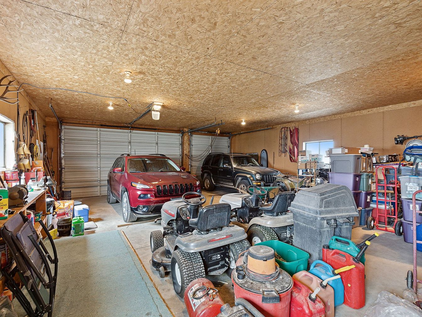 The garage showcases a spacious layout with two vehicles parked side by side, a red SUV and a black Jeep. The walls are adorned with beige panels and the ceiling features a natural wood finish. Fluorescent lights provide ample illumination throughout the area. Various tools and household containers are neatly organized on wooden shelves lining the sides, showcasing a practical color palette of greens, blues, and grays. Lawn equipment, including two riding mowers, occupies part of the floor space, accompanied by multiple gas containers, hinting at a landscape maintenance hobby. The overall aesthetic combines functionality with a utilitarian charm.