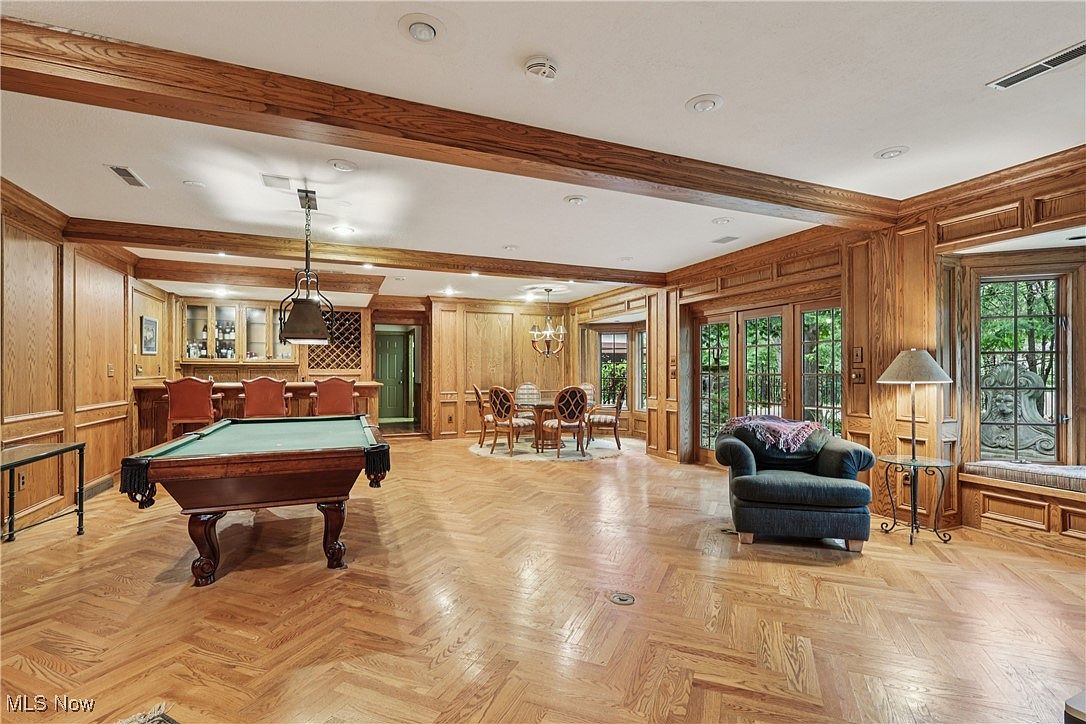 Spacious entertainment area featuring elegant wood paneling and matching wood beams, with a herringbone hardwood floor throughout. A classic pool table anchors the room, complemented by a cozy sitting area with a plush, dark upholstered chair, lamp, and window seat at the far end. The bar area has high chairs with warm-toned upholstery and built-in cabinetry, including shelves for glassware and a lattice wine rack. The dining space includes a round table surrounded by upholstered chairs under a modern chandelier. Large windows and French doors frame lush greenery, bathing the room in natural light and enhancing its inviting, classic atmosphere.