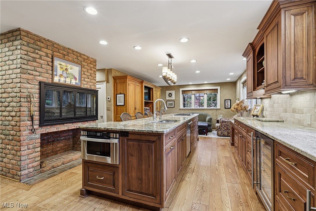 A spacious kitchen features warm wood cabinetry and granite countertops that stretch along two sides, framing a large central island with seating and an under-counter microwave. Natural wood floors complement the cabinetry, adding to the inviting, earthy tone. A striking exposed brick fireplace sits to the left, topped with framed artwork and a modern inset firebox. Soft recessed lighting across the ceiling creates a bright, open atmosphere. The kitchen transitions seamlessly to a cozy sitting area at the far end, where a large window and comfortable seating invite relaxation, blending traditional and contemporary elements in a harmonious layout.