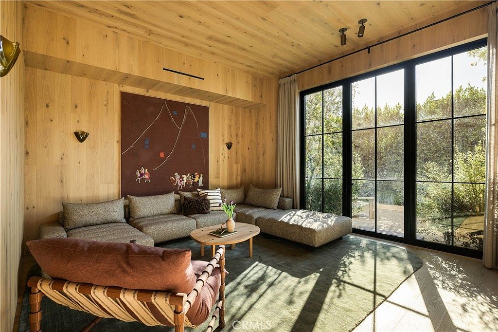 A cozy sitting area features light wood-paneled walls and ceiling, enhancing a tranquil atmosphere. A plush, L-shaped sectional sofa with neutral-toned cushions anchors the space, accompanied by a low, round wooden coffee table holding a vase of fresh flowers. A woven lounge chair with a brown cushion faces the sofa. Large black-framed glass doors let in abundant natural light and open to lush greenery outside. Minimalist wall sconces and a piece of abstract art with muted colors and subtle figures add interest without overwhelming the room’s understated, nature-inspired color palette. Curtains frame the windows, softening the modern lines.
